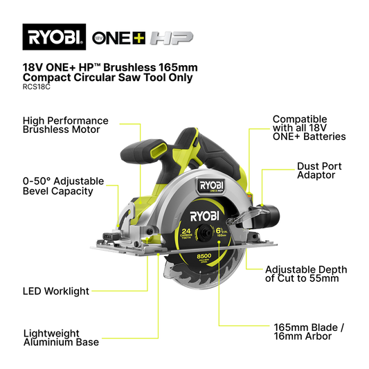 • Ryobi 18V One+ HP Brushless Circular Saw RCS18C - 165mm - Lightweight - Clean Cuts
