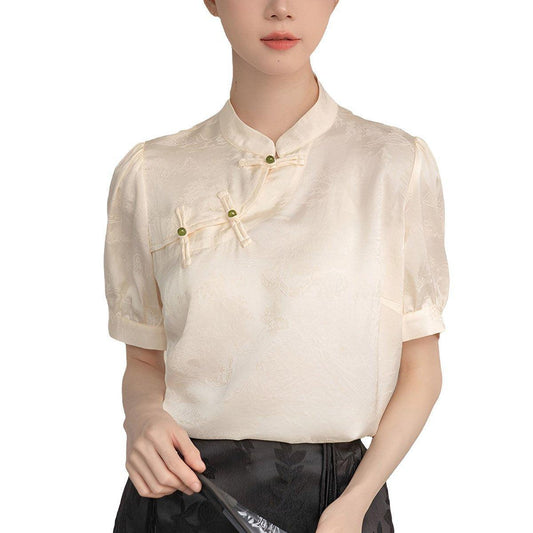 Elegant Satin Short Sleeve Blouse Women - Chinese Button Top Ivory S