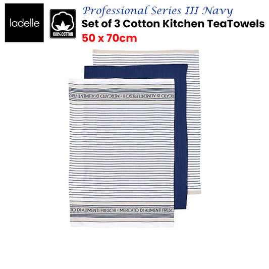 Ladelle Set of 3 Cotton Kitchen Tea Towels 50 x 70 cm - AZO Free, Navy
