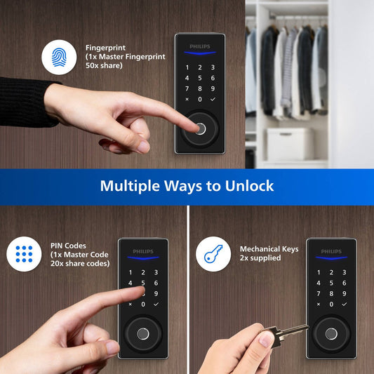 Philips Black Easykey Fingerprint Deadbolt Lock - 3 Access Modes - 700mm x 1650mm