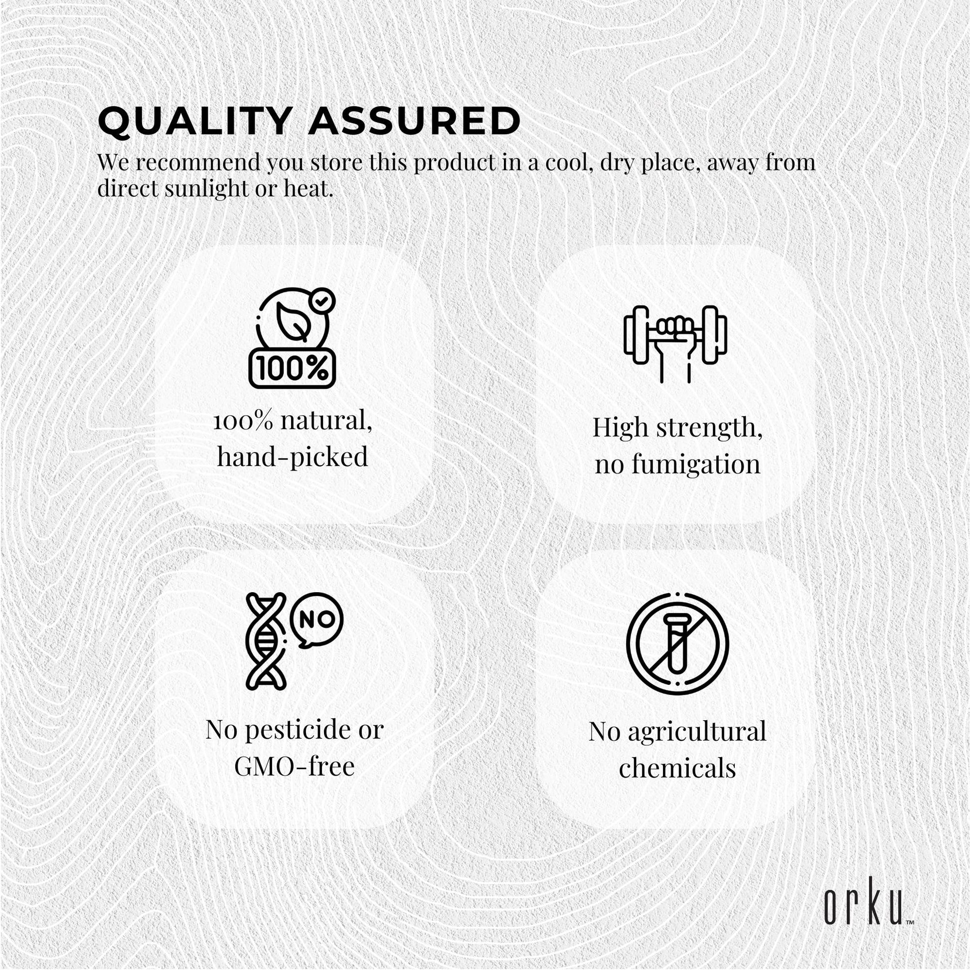 Our Orku one-time cold-pressed pure Ethiopian Black Seed Oil is 100% natural, containing one of the highest levels of Thymoquinone (TQ). Slightly filtered, our black seed oil is non-refined, with no additives or preservatives, no agricultural chemicals or pesticides, and is GMO free.