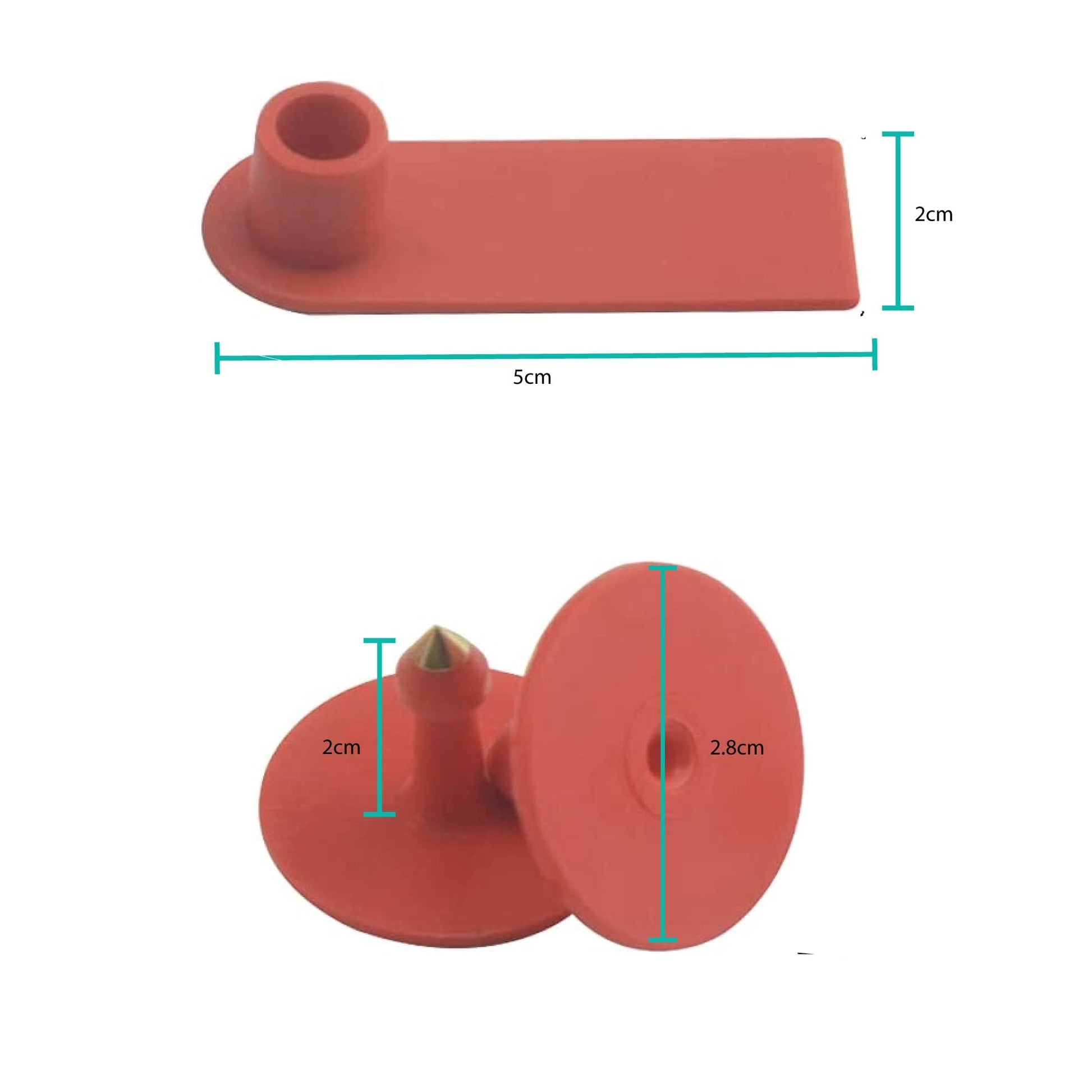 Color: Red - allows for easy identification of animals in different settings; despite slight color variances due to random selection, the red tags are consistently visible against most backgrounds. This choice enhances safety and security during breeding populations or meat quarantine scenarios.
