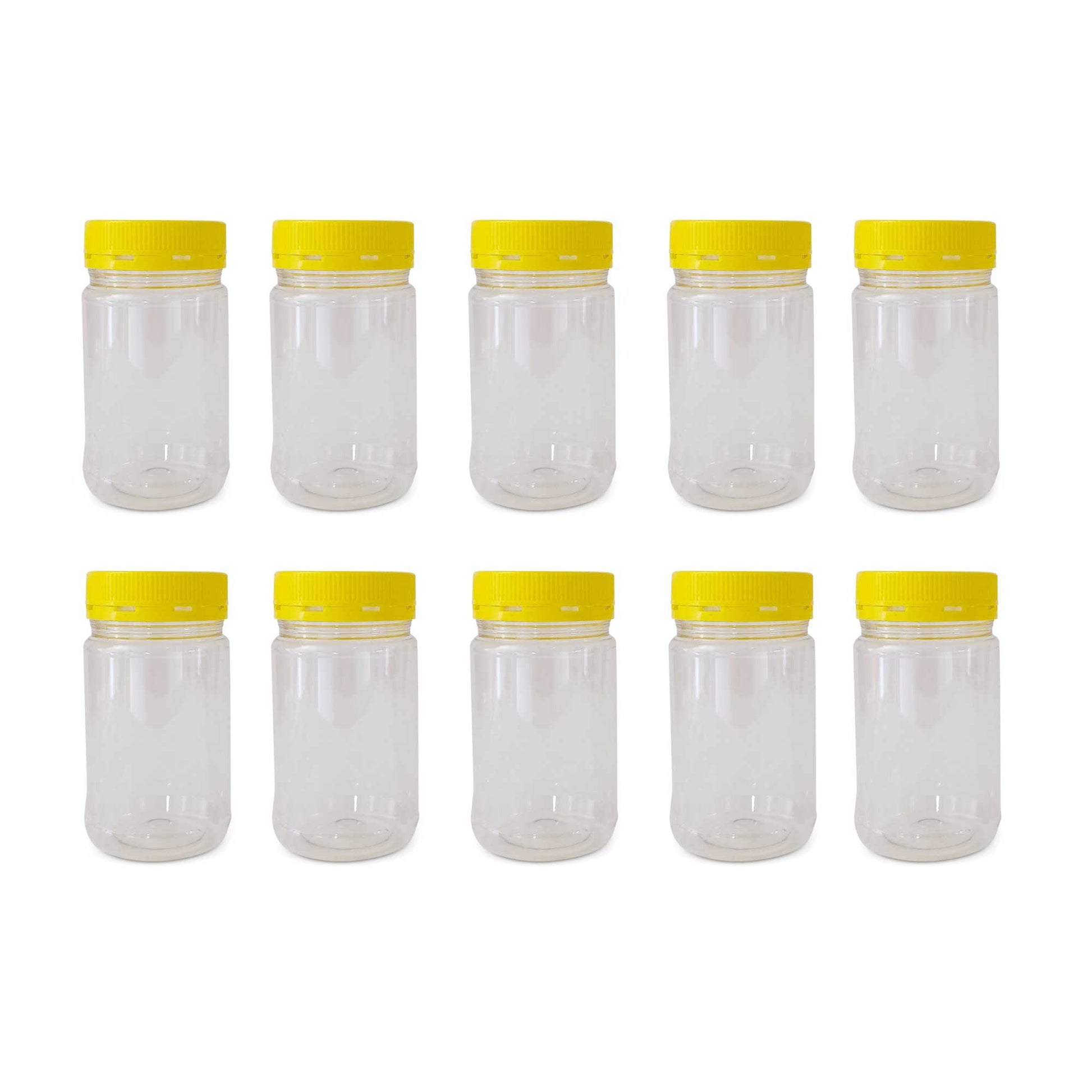 Round plastic empty food grade jars with yellow tamper evident lids, commonly used for packing food products and items such as beads, crafts, decorations, honey, grains, beans etc.