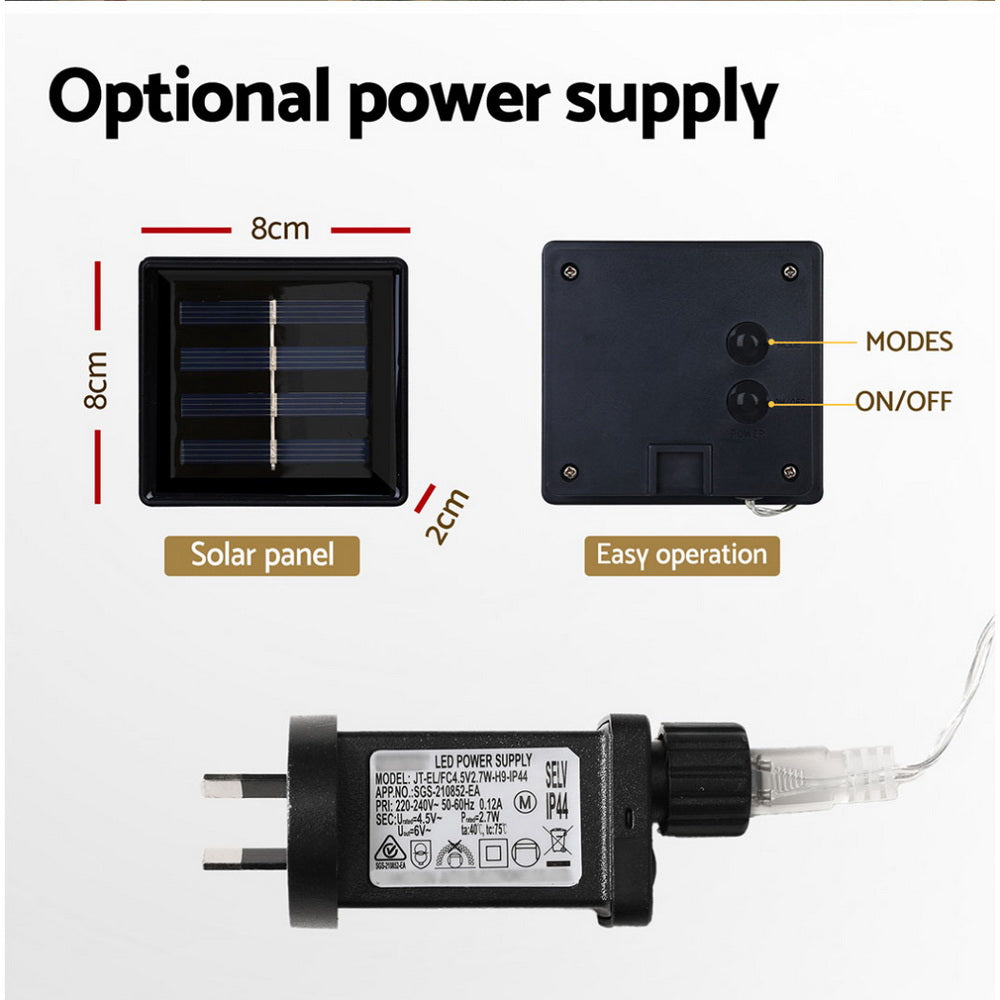 Features6m icicle lights with 32 dropsLifespan of up to 25,000 hoursEight lighting modes with a mode-switching controllerLow power consumption5m lead cable for versatile setupLow voltage for safe touchWater-resistant for indoor and outdoor use Note: Plug/transformer must be kept dry