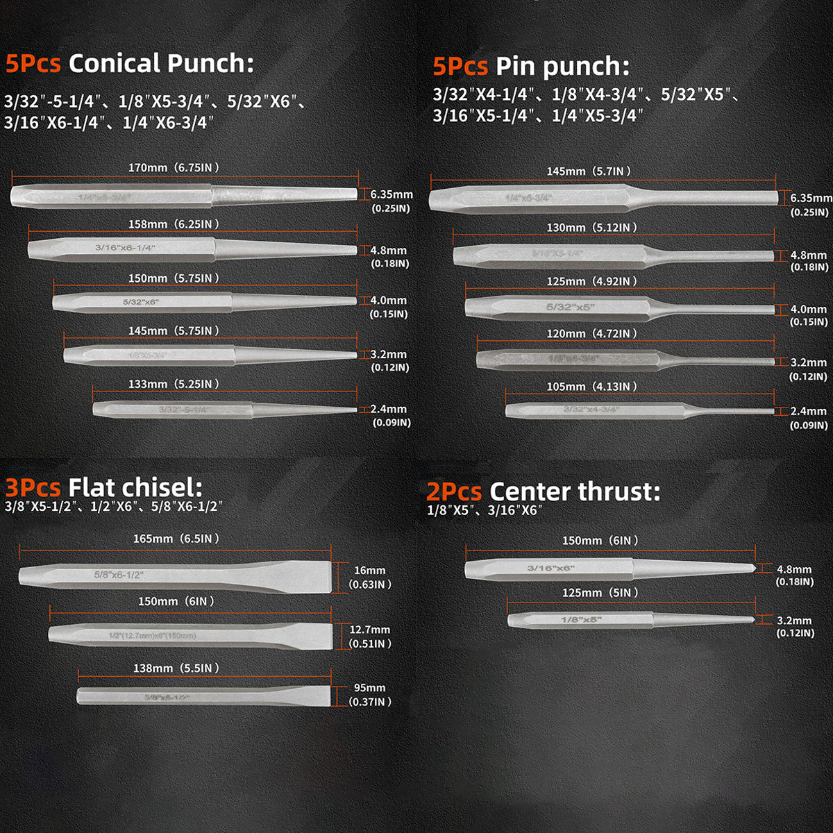 5 × Taper Punches, 5 × Pin Punches, 3 × Flat Chisels, 2 × Center Punches, 1 × Chisel Gauge, 1 × Tool Storage Pouch
