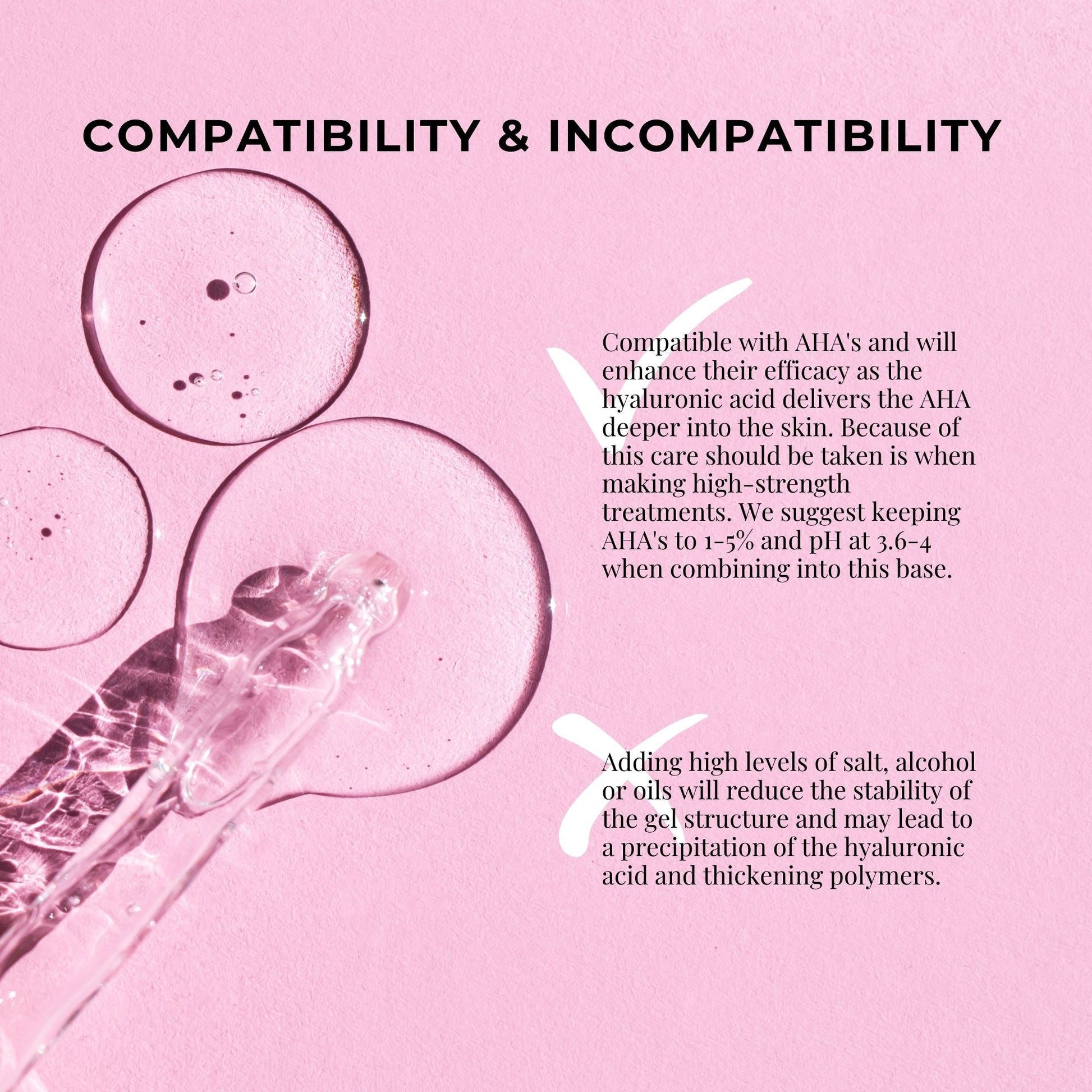 Incompatible Ingredients: Adding high levels of salt, alcohol or oils will reduce the stability of the gel structure and may lead to a precipitation of the hyaluronic acid and thickening polymers.Directions For Use: Decant into a serum pump or dropper bottle and use after cleansing as a hydrating serum base. You can then follow up with moisturiser or night cream if you wish.Apply to the skin up to twice a day to boost hydration, reduce skin irritation and boost skin resilience and barrier function.