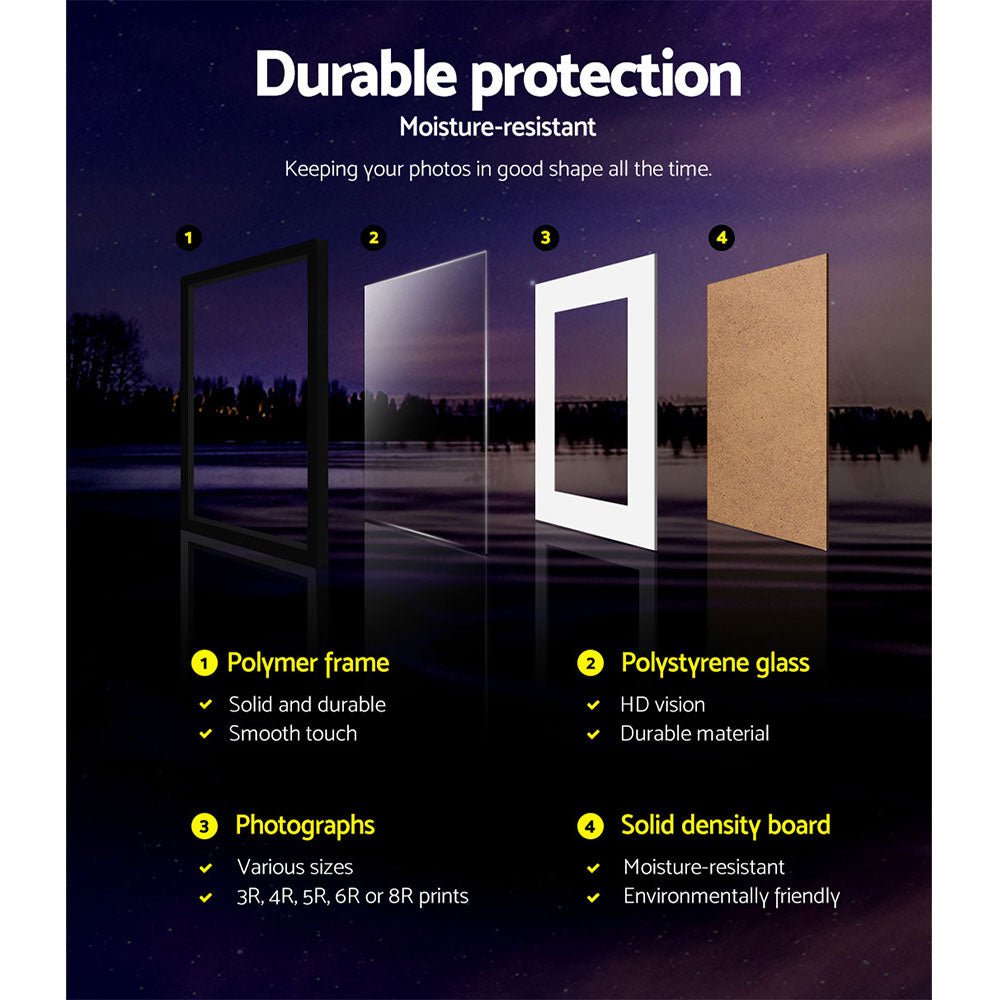 This set allows your walls to be adorned with fascinating stories and memorable moments. Suitable for A3 photograph size, the frames feature durable polymer construction with polystyrene glass to keep your prints in good shape.