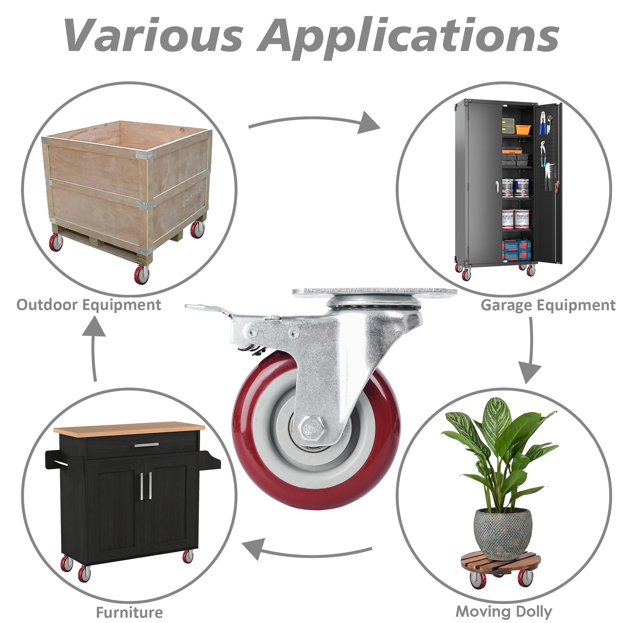 The 4" casters feature a polyurethane protective wheels, integrated steel sleeve bearings, and a sleek modern industrial design ideal for work or exterior design elements