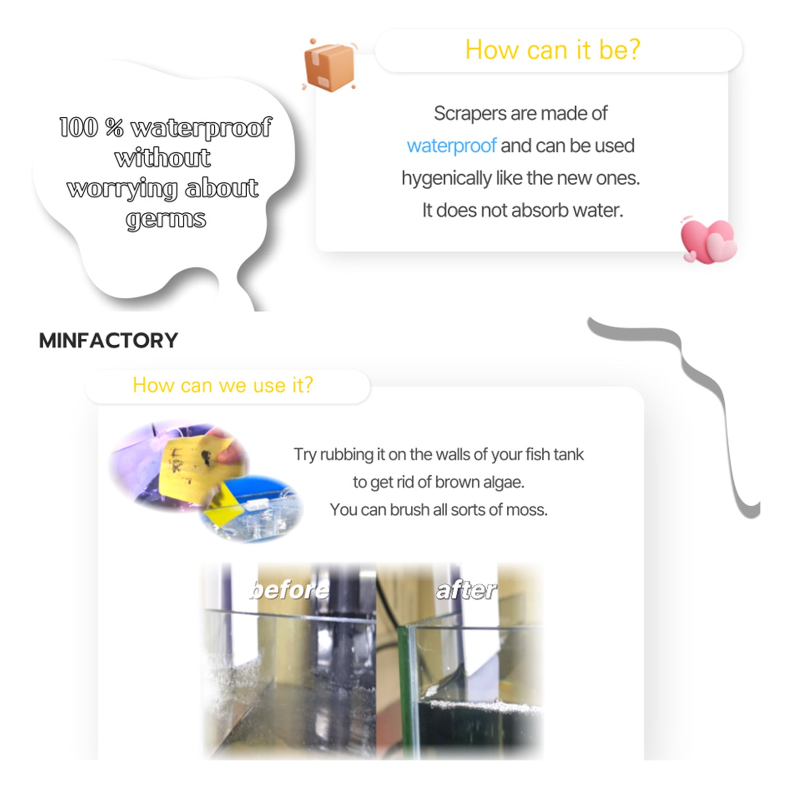 Experience the transformative power of Minfactory's reusable fish tank moss scrubber for crystal-clear aquariums with our durable set of four pieces, crafted in Korea from waterproof synthetic resin. Designed to gently remove algae and stains without scratching your glass tanks - perfect for both low iron and acrylic models.