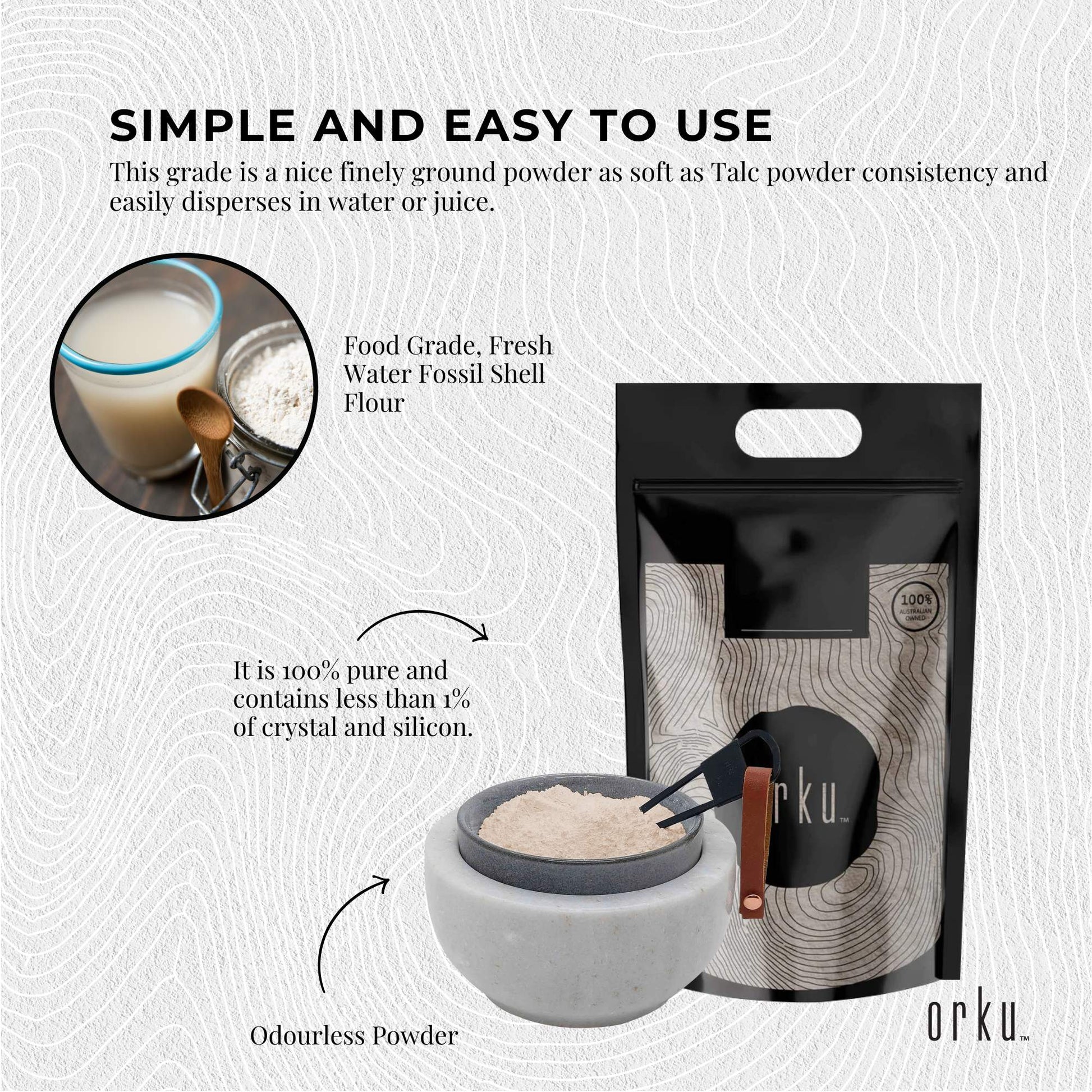 Ultra Fine Organic Food Grade Diatomaceous Earth is a superior off white powder, sterilised for consuming by heat treating via sunshine or UV light - enough to kill bacteria and pathogens but not harm the Diatomaceous Earth. It is 100% pure and contains less than 1% of crystal and silicon. Particle size is approximately 20 UM.This grade is a nice finely ground powder as soft as Talc powder consistency and easily disperses in water or juice.Organic Food Grade Diatomaceous Earth is a natural pest and parasite control, for all pets and humans, suitable for; consuming, feeding and dusting pets, and dusting the house and garden.Organic Food grade Diatomaceous Earth has been approved by the FDA as a food product.