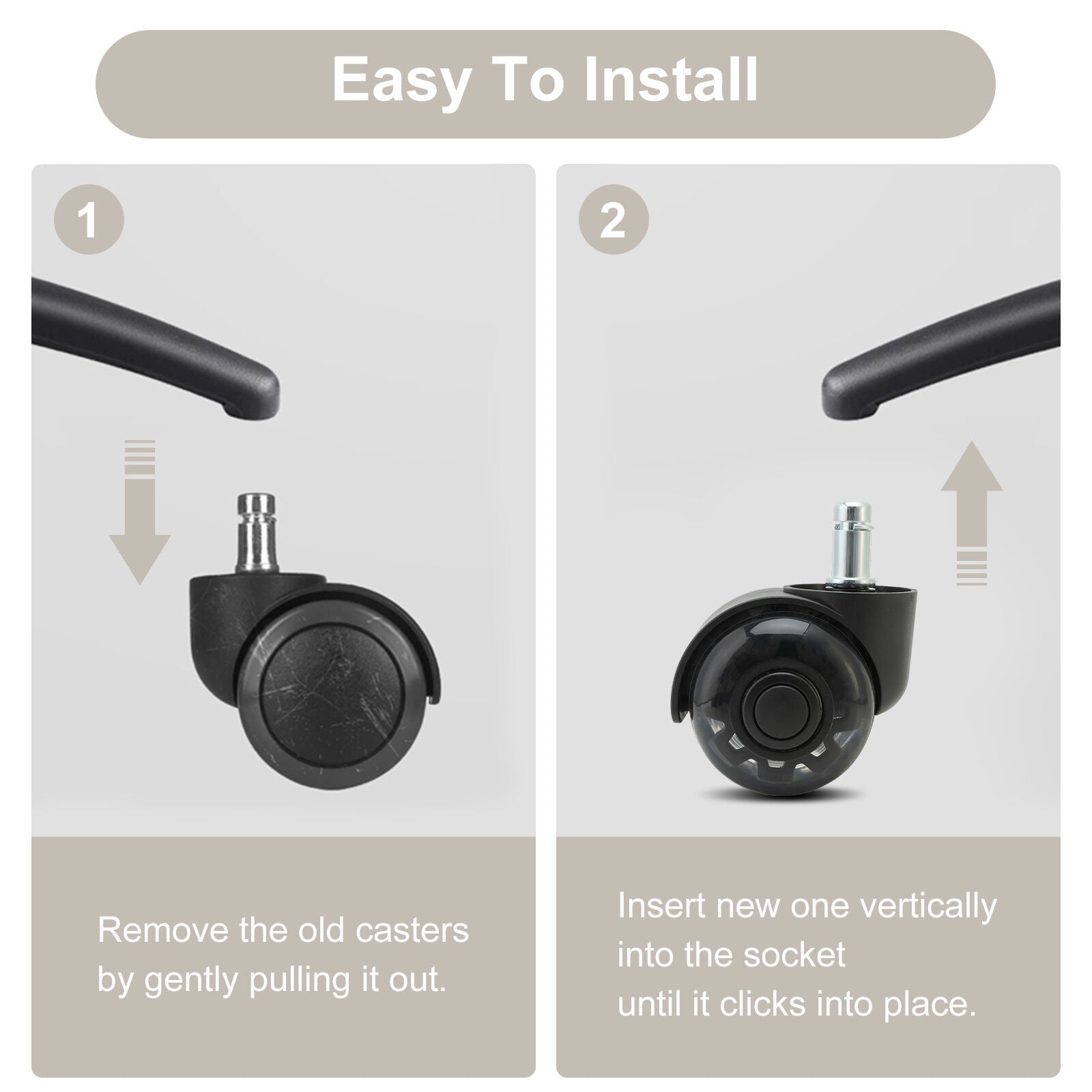 Installation is simple. Just insert them into the existing leg socket of your office chair or compatible furniture. They fit most office and gaming chairs.