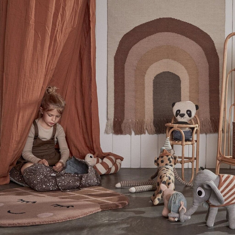The gorgeous Acorn Floor Rug is a rich chestnut brown colour in two shades, with a serene, smiling face detailed in black with rosy, pink cheeks. The Acorn Rug is the perfect match to the new colourway.Made from 80% wool and 20% cotton to the highest quality, this stunning piece of design will bring both character and style to your playroom or child's bedroom. Acorn Rug is nice and thick to protect little hands and knees as a playmat during floor time.
