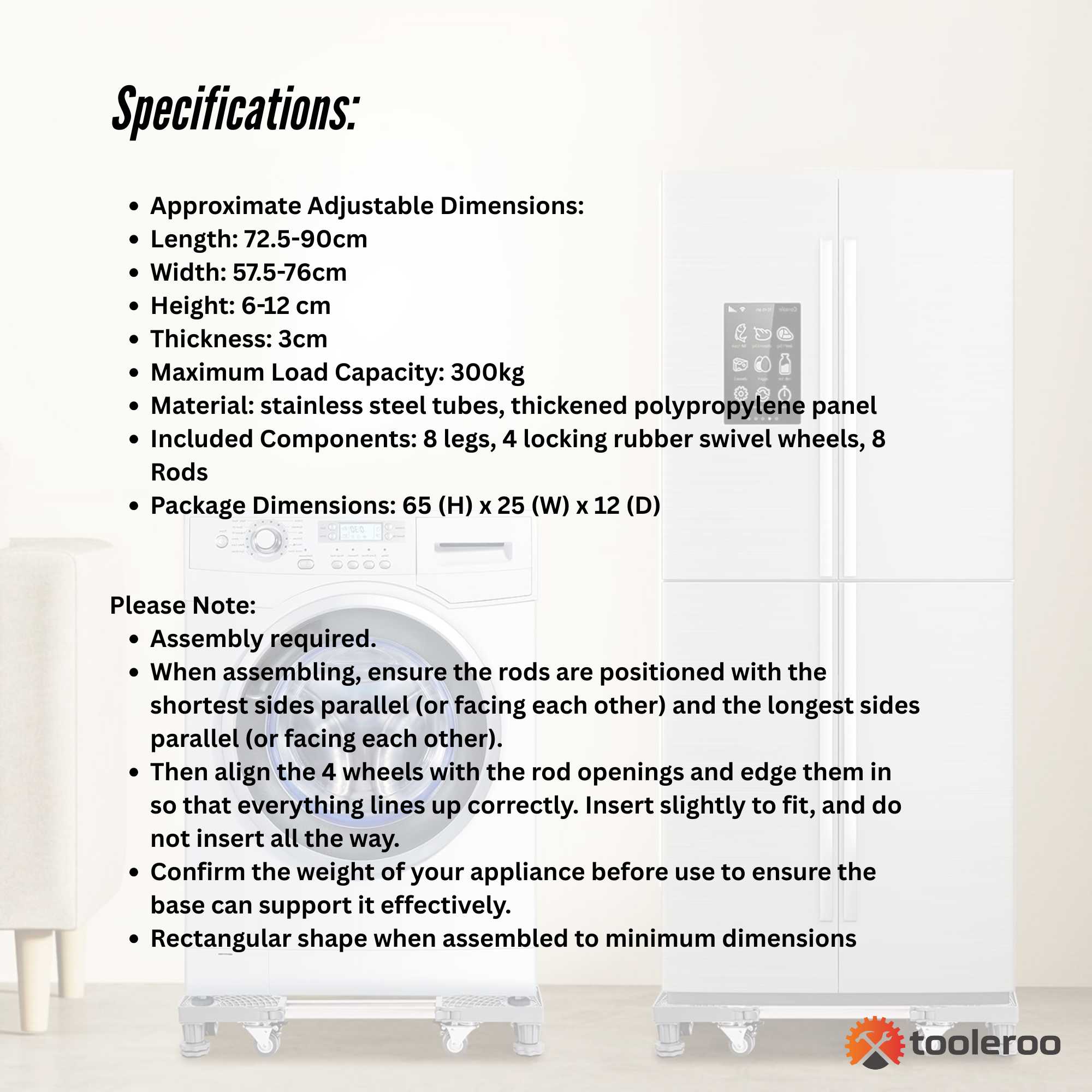 Maximise the utility of your small living area with our versatile and adjustable washing machine mobile base with wheels. This innovative base is designed to fit a variety of appliances, making it the perfect solution for units and compact spaces.