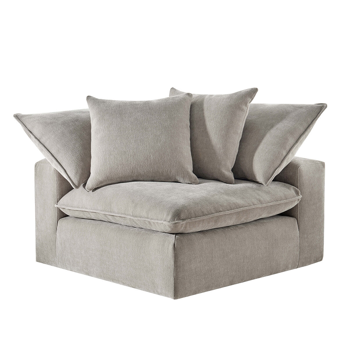Enhance your living space with the Aiden & Ivy Sereen Corner Sofa, a fully upholstered modular sectional designed for flexibility and style. This corner piece seamlessly integrates into your existing Sereen sectional, serving as an end-seat, floating chair, or part of a larger configuration. Customize your setup by combining it with armless chairs or ottomans, creating a sofa that perfectly fits your space. Includes 2 matching pillows for added comfort and style.