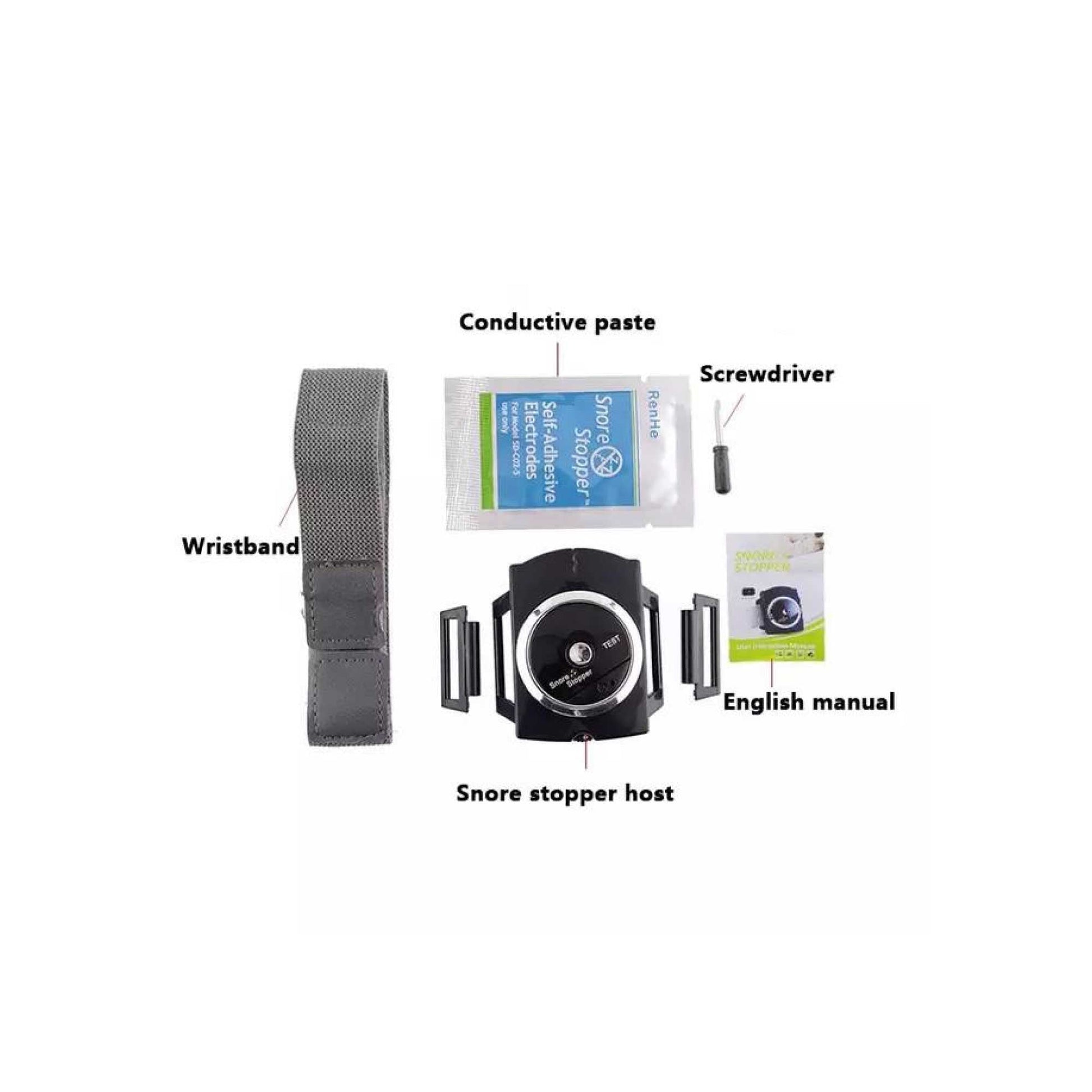 The Snore Stopper Watch is a revolutionary device. It features a specially designed biosensor with logic-control IC. When Snore Stopper detects snoring, a gentle, 4-second electrical pulse will be sent automatically to stimulate nerves on the snorer's skin. Then the brain senses this nerve stimulation, and reminds or trains the snorer to change the sleeping posture, thereby reducing snoring.