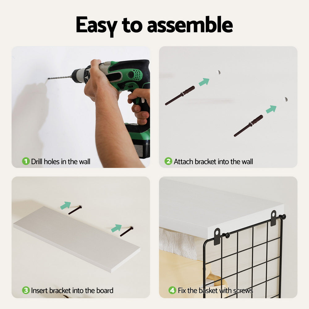 This set includes three shelves and a metal storage basket, perfect for organising and displaying items in your bathroom, kitchen, living room, or bedroom. The space-saving design frees up floor space, while the easy assembly and maintenance make it ideal for any household. Add functional elegance to your interior with these versatile shelves.