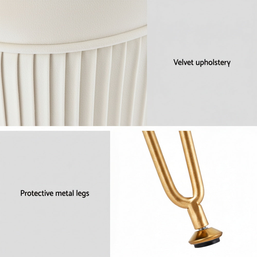 Enhance your home decor with the Artiss Round Velvet Footstool. This stylish footstool features a vertical stripe design and is made with a durable MDF frame and high-resilience foam padding. It includes protective metal legs and is easy to assemble, making it a functional addition to any room.