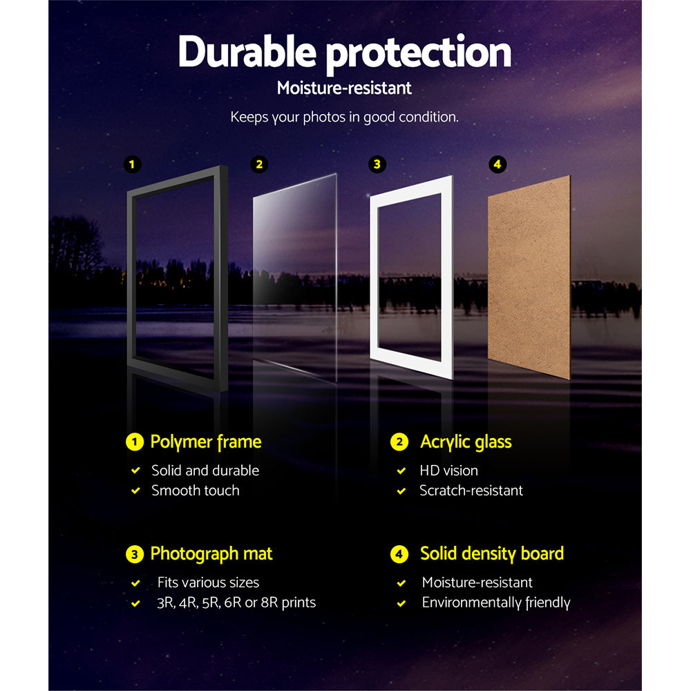 Every picture tells a story. So why not frame up the interesting ones on the wall and share the stories behind them to friends and family? Available in a set of 11, our set allows your walls to be graced with fascinating stories and memorable moments from your treasured photographs. Arrange them in any way you like. Portrait or landscape, the framed photo feature wall is a conversational piece in its own right. Suitable for a range of photograph sizes from 3R to 8R, the frames feature a durable polymer construction with a polystyrene glass to keep your prints in good shape. The hardboard backing is also moisture-resistant. Hanging accessories are also included with your purchase.