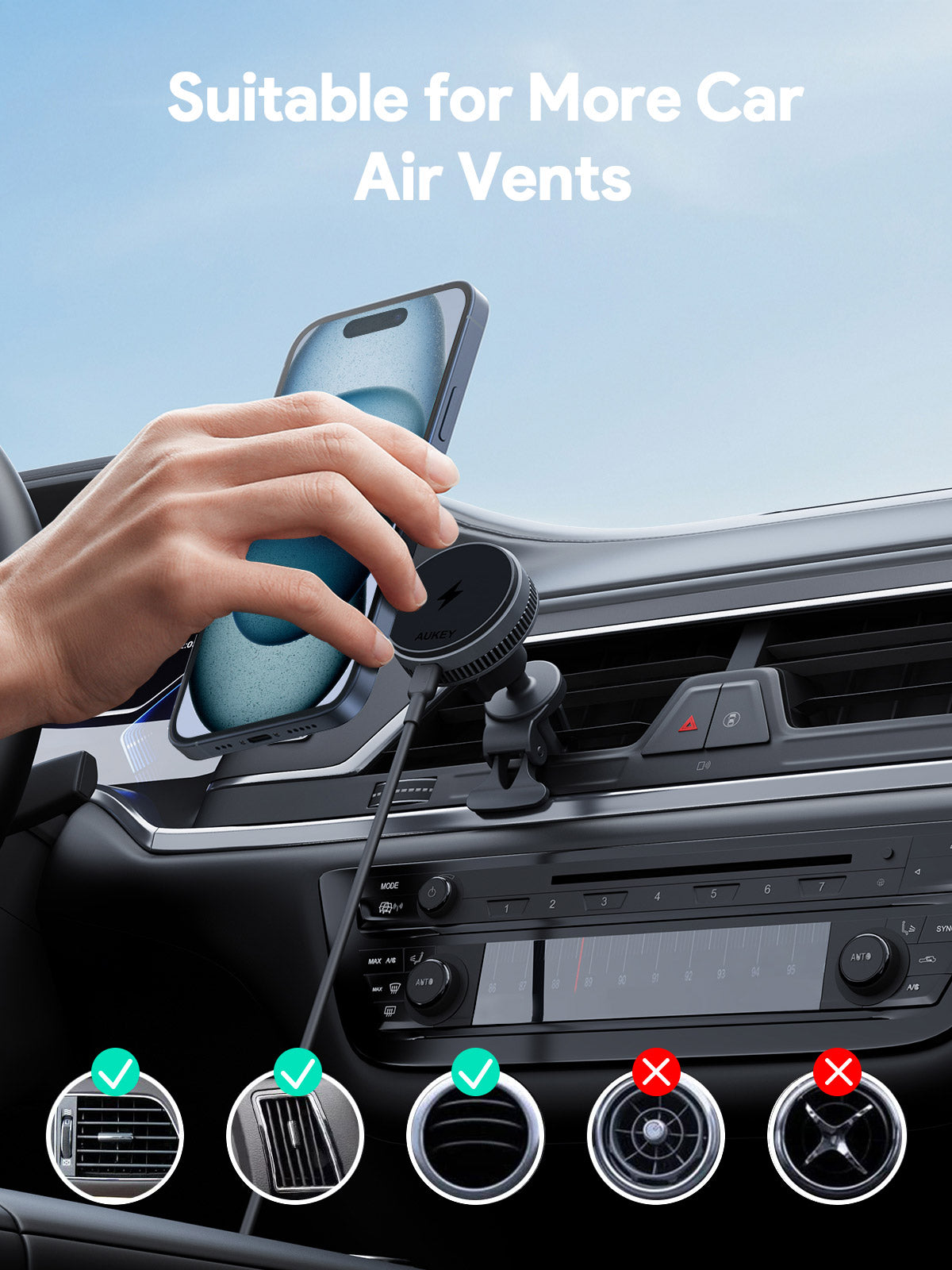 The Aukey Wireless Car MagSafe Holder/Charger provides fast 15W charging and secure phone mounting. With its active cooling fan, it prevents overheating during use.