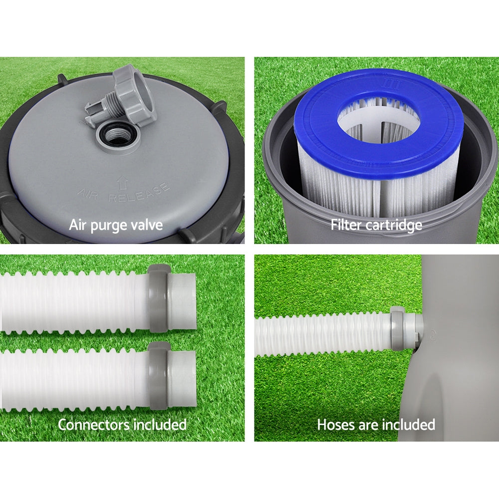 Compatible for use with Bestway above-ground swimming pools, the Bestway Filter Pump is ideal for keeping the pool clean and clear at all times. The pool water is pumped through a cartridge filter at a powerful rate of 3028 litres/hour and returned crystal clear and free of contaminants. The pool system water flow rate is 800 gal/hour. An air purge valve helps to release the air to prevent any unnecessary pressure build-up. Also included is a filter cartridge, which traps and filters dirt and debris, and adaptors for pool valves.