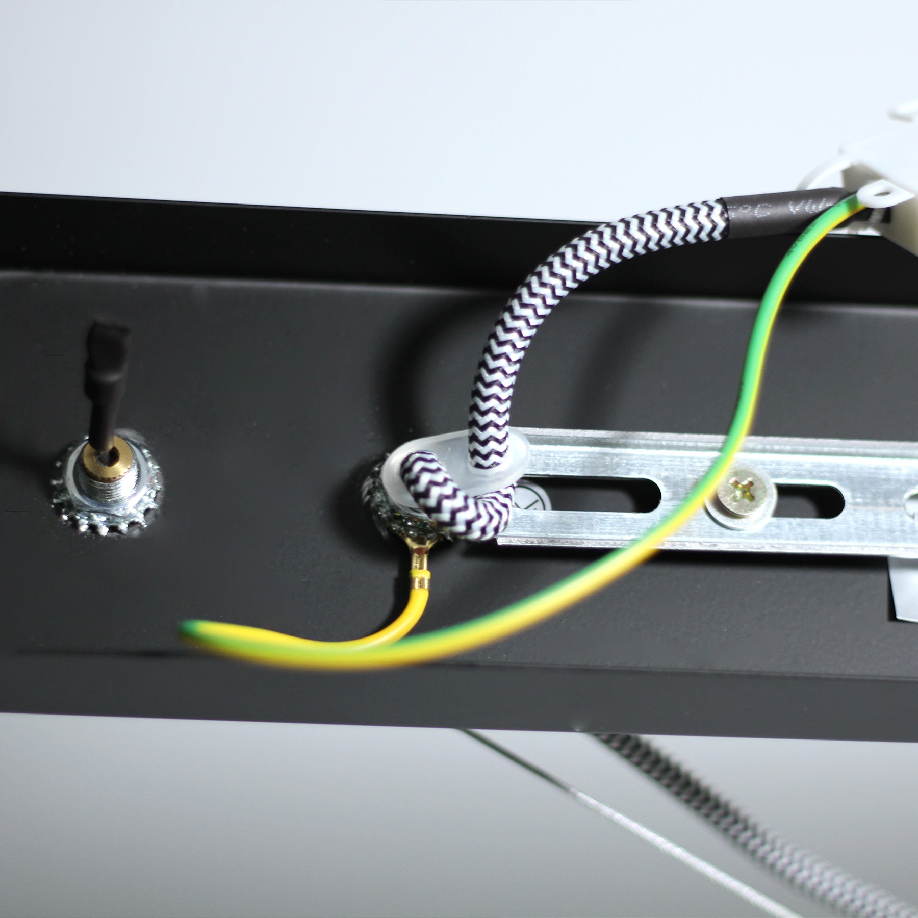 The rectangular ceiling base suspends a rounded metal bar parallel to the ceiling by two steel suspension wires. The four globe holders that drop from the lighting bar each have long grey braided cords that can be wrapped around the lighting bar to set heights individually. The heights can set to your preference, whether after a staggered look, or a short non-invasive drop, or a long, purposeful hang. The Bikkel Four Light Pendant comes in black and white and requires four E27 globes.