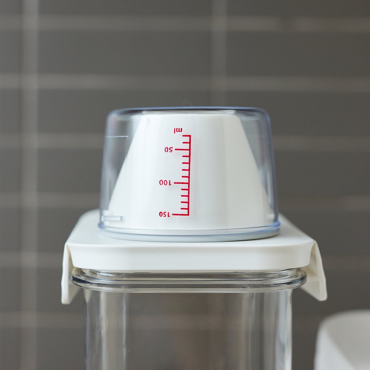 Boxsweden 1 1l Crystal Laundry Container Small is a durable storage solution designed for dry items in your laundry room, featuring a measuring cup and easy pour spout.