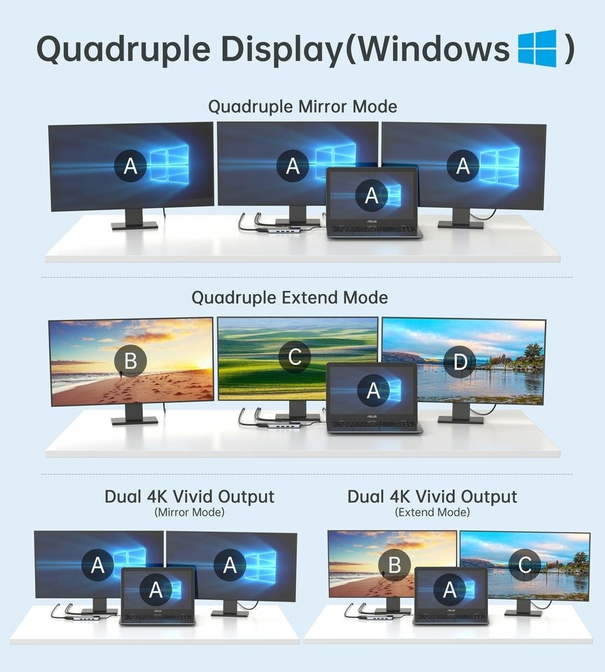 Massive ExpansionExpand your laptop's ports with 2 x HDMI, VGA, 2 x USB3.0, 2 x USB2.0, SD, Micro SD, RJ45, 3.5mm jack as well as a USB-C PD charging port.Transform it into a universal machine.Tripple DisplaysEasily connect three additional monitors.Output up to 4K UHD through HDMI ports.PD100WCharge your USB-c laptop with up to 100W power using Power Delivery (PD) technology.5Gbps SuperSpeedTwo USB3.0 allow you to transfer large files such as HD Movies in just seconds, with 10X faster data transfer than USB2.0 (480 Mbps)Plug and PlayNo additional drivers or power required, simply plug and start using right away.