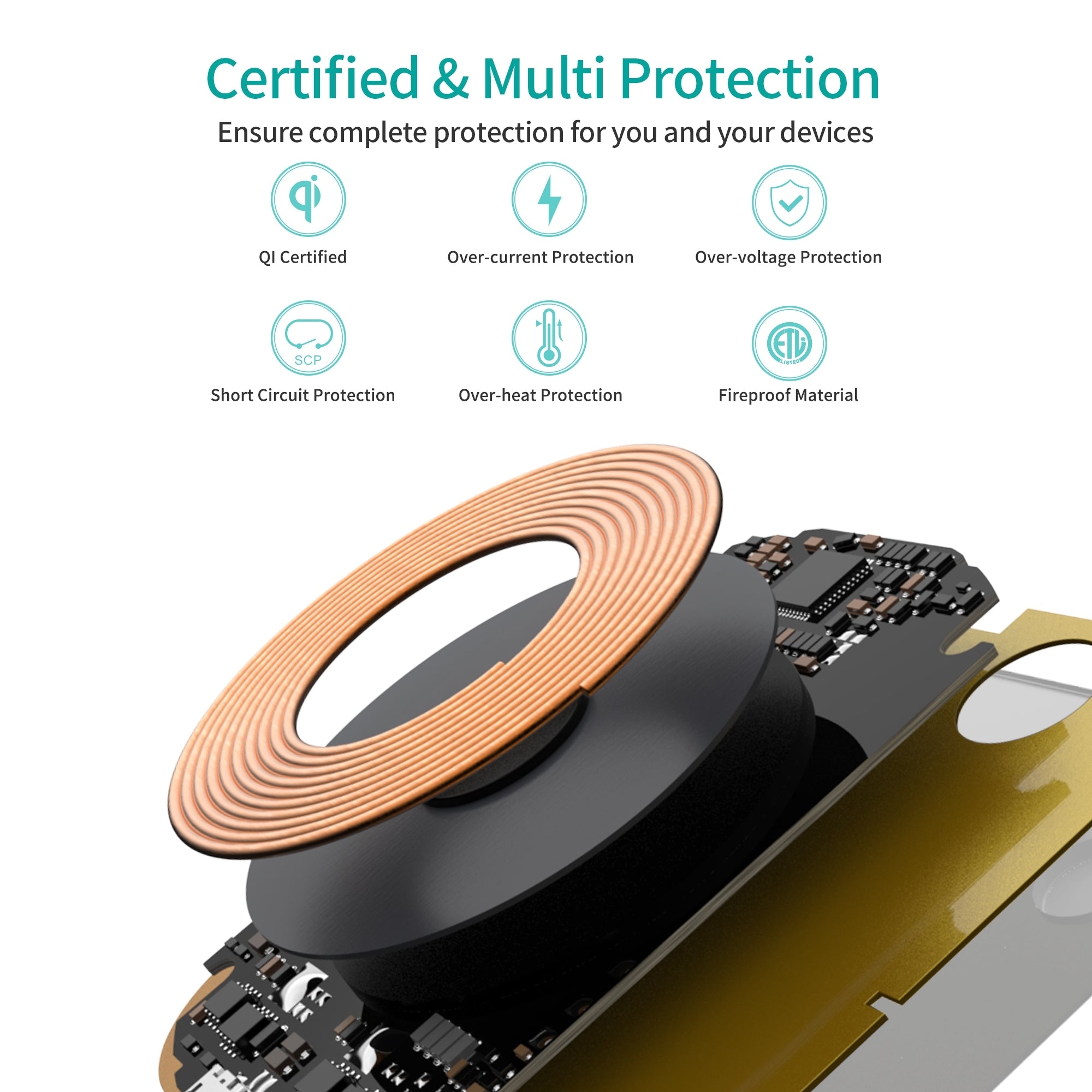 Intelligently Identify Charge ModelsFast wireless charge up to 10W for the Samsung Galaxy S9, S9 Plus, S8, S8 Plus, Note 9, Note 8, S7, S7 Edge, S6 Edge+, 7.5W wireless charging for iPhone X/ XS / XS Max/ XR/ 8/ 8 Plus ( QC2.0/3.0 adapter needed for fast charge) and 5W standard wireless charge for all Qi-enabled Phones.Ultra Slim CompactUltra slim wireless charging pad with anti-slip rubber to keep it stays in place, wireless charging pad's indicators and compact build ensure simple and convenient charging.Case Friendly DesignOur wireless charger can identify your phone sensitively and support phone case within 5mm(0.2 inches) while 4mm(0.16 inch) is the best wireless charging distance (Please note that metal attachments or credit cards will interfere with charging ).Compatibility Safe ProtectionThe wireless charger works with QI enabled device like iPhone X/8/8 Plus, iPhone XS/iPhone XS Max/iPhone XR, Samsung Galaxy S9/Note 9/Note 8/S8/S8+/S7/S7 Edge/Note 5/S6/S6 Edge/S6 Edge Plus and other Qi-Enabled devices, Multi protection system for all-around protection against over-charging, over-voltage, over temperature and over-current, provide a safe charge to protect your devices.Led indicator displays charging statusNon-disruptive LED indicator to let you know that your phone is actually connected.Rubberized baseNon-slippery surface lets your phone stay in the pad neatly to deliver steady chargeSpecifications: