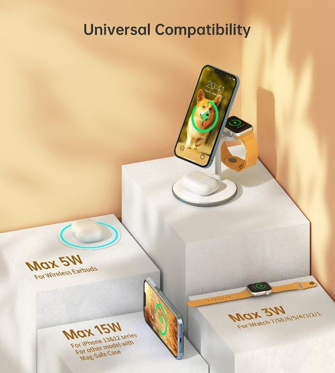 Power in 1s SnapBuilt in with dedicated magnets, the wireless charging spots provide precise mag safe alignment for your electronic devices. Wireless solid magnetic connection ensures the convenience and security of charging and holding your devices in any orientation portrait or landscape.3 in 1 Wireless Charging StationThe wireless charger stand acts like a mini stand, holding and charging your iPhone , Apple Watch and AirPods in one place, helping you end the messy cord life and tidy your desktop. 3 charging docks for different charging options as you need.Fast and Safe Wireless ChargingThis magnetic wireless charger can charge your iPhone 14/13/12 from 0% to 100% in 3-3.5 hours (Based on our lab tests). Nearly as fast as the original Apple Mag-Safe charger. With an upgraded safety system and CE, FCC and Qi-certificates, this wireless charger station provides double guarantees to ensure fast and safe charging!Anti-Slipping & Place-Saving DesignOnly one cable and one charging stand is needed for your desktop to power all your Apple devices simultaneously. Bottom with anti-slip silicone design, the wireless charger stand will not move or flip when charging.Package3 in 1 Charging station x 1, USB-C to USB-B cable x 1. A/C Adapter NOT included.