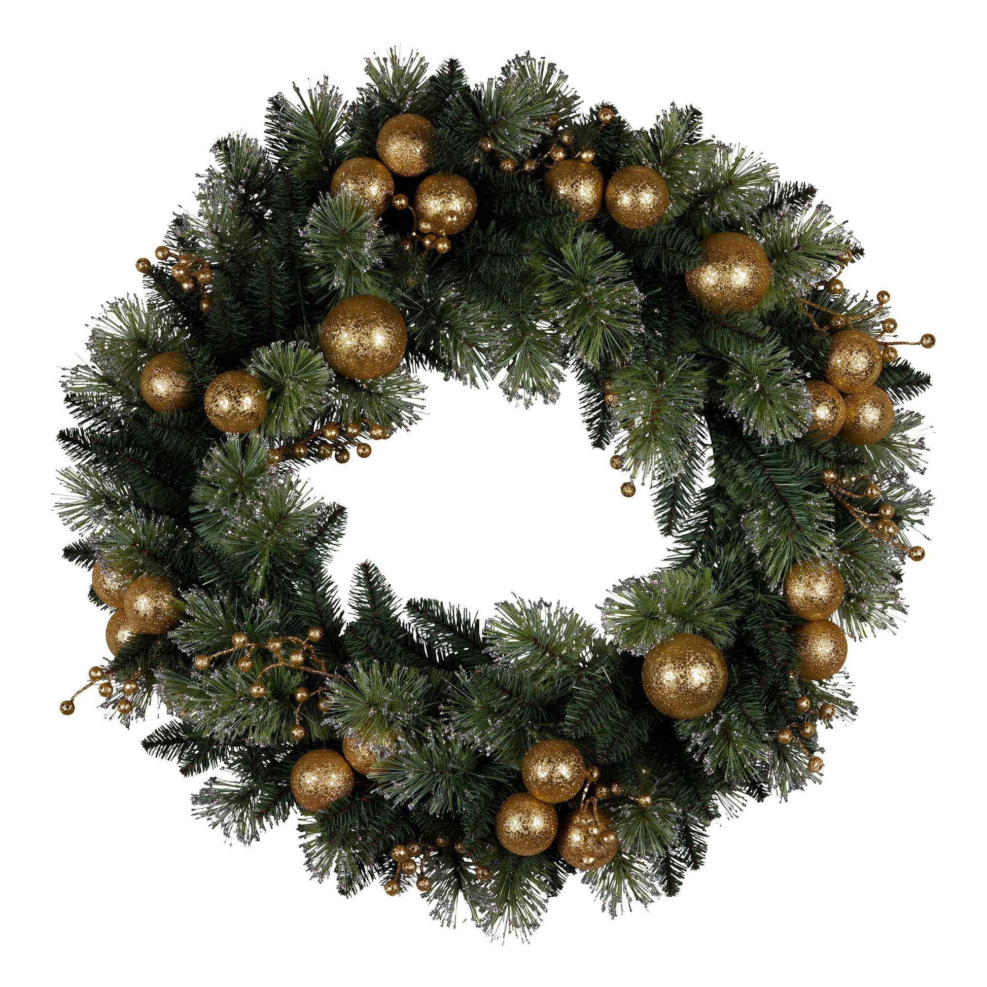 Christabelle 61cm Christmas Wreath Glittery Tipped with LED Lights and Golden Baubles Front Door Decoration Ornament