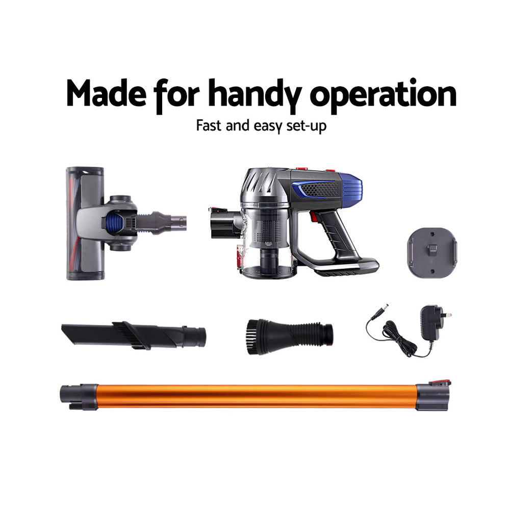 Our Devanti Handstick Vacuum Cleaner gives you the freedom to use it in any tight space or where spot cleaning needs to be done without lugging a big machine behind. Its powerful 150W 30000rpm motorised head has a steady suction power of up to 10000Pa and comes with two-speed suction for more vacuuming options. The 160 degree swivelling head can also be fitted with brush or crevice nozzles for different types of surface and zone cleaning that allows it to pick up dirt and debris easily. That makes the vacuum ideal for cleaning carpets, curtains, shelves, soft furnishings, vehicle interiors and delicate objects as well as vacuuming ceiling, corners, niches and gaps. The one-handed design is lightweight and bagless. All collected dirt and debris pass through a washable and reusable HEPA filter that eliminates up to 99.97% of dust and allergens. Not least, the vacuum cleaner can work its magic for up to 35 minutes of continuous running time on low speed (25 minutes on high speed) with the rechargeable 2000mAh lithium-ion battery. Features: Cordless and lightweight Long reach LED headlight Suitable for carpet, rugs, hard flooring, upholstery and curtains Adjustable 2-speed suction power control 160 degree swivelling head Pivoting head Tilt and angle adjustment Flexible stick movement One-handed design to empty dust container Bagless with HEPA filter Washable and reusable HEPA filter Eliminates up to 99.97% of dust and allergens 2000mAh Li-ion battery Quick battery charging **Sofa brush, 2-in-1 convertible nozzle and wall-mounted holder included Specifications: Brand: Devanti Power: 150W Suction power: 10,000Pa Motor rotate speed: 30,000rpm Battery capacity: 2000mAh Running time: 20-35 minutes Charging time: 3-4 hours Dustbin capacity: 0.6L Adaptor cable length: 180cm Overall dimensions: 25.5cm x 20.5cm x 118.5cm Colour: Gold and grey Package Contents: 1 x Devanti Handstick Vacuum Cleaner 1 x Floor Brush 1 x Metal Tube1 x Sofa Brush 1 x 2-in-1 Convertible Nozzle 1 x Rechargeable Battery 1 x Charger Adaptor1 x Wall-mounted Holder 1 pack x Wall-mounting Accessories1 x Cleaning Brush1 x User Manual