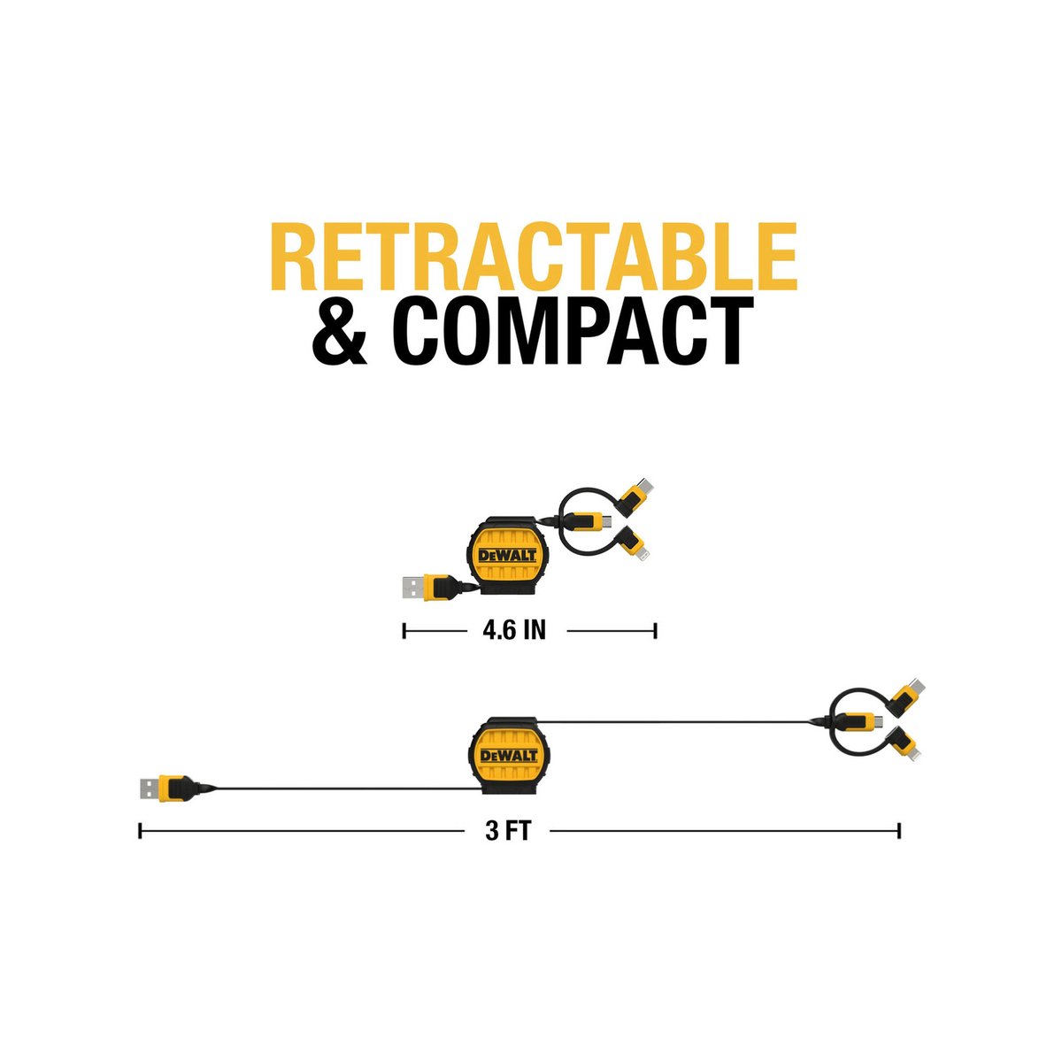 Dewalt 1m Lightning Type C and Micro Usb to Usb 3 in 1 Retractable Charging Cable Reinforced with Kevlar is a versatile charging solution designed for various mobile devices.
