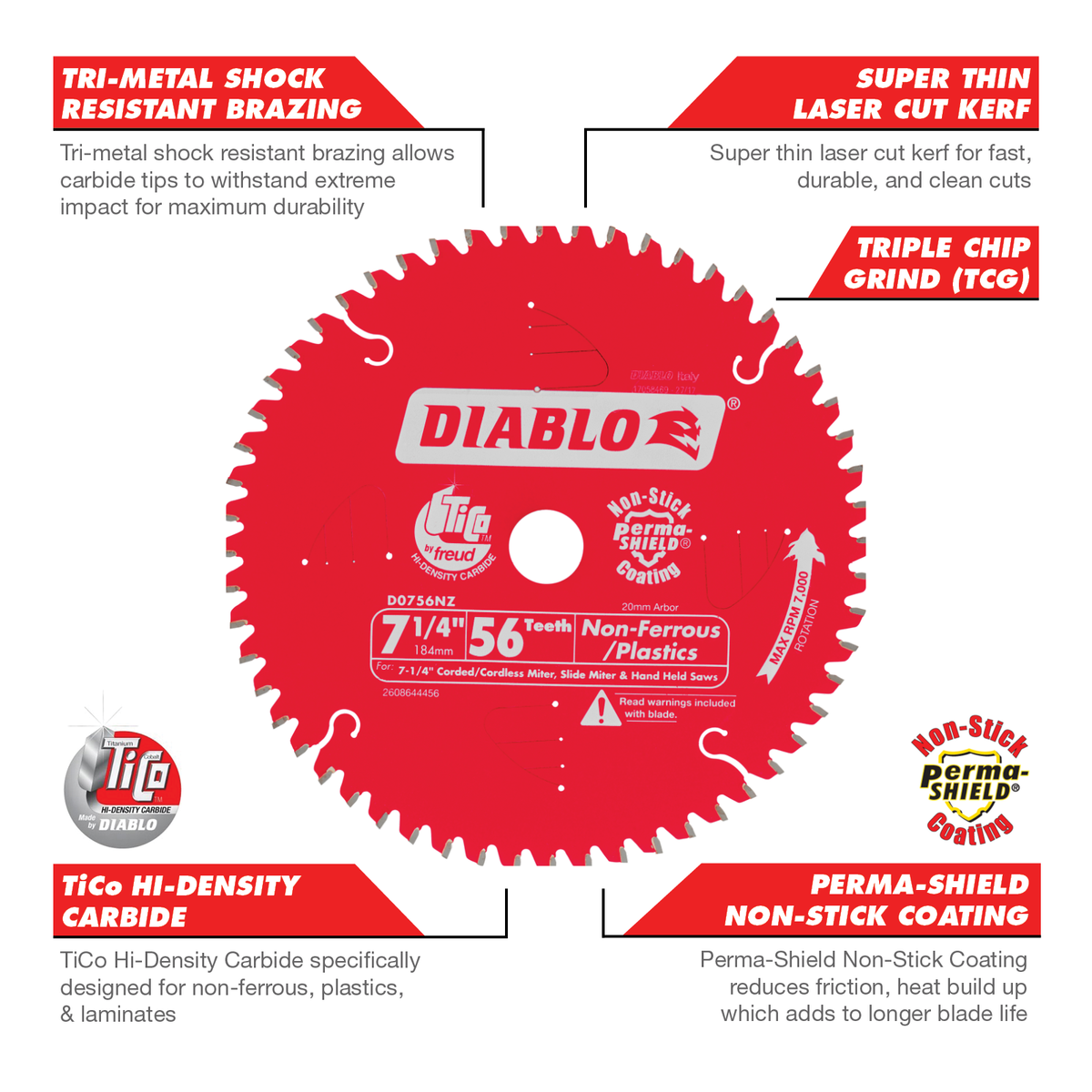 The Diablo 184mm 56t Non Ferrous Plastic Circular Saw Blade features a TiCo Hi-Density Carbide construction specifically engineered for non-ferrous materials. Its Perma-shield non-stick coating minimises friction and heat build-up, contributing to an extended blade life. The tri-metal shock-resistant brazing ensures that the carbide tips can endure extreme impacts, enhancing durability. With a Triple Chip Grind (TCG) tooth design and a super thin laser cut kerf, this blade provides fast, clean, and burr-free cuts. It is ideal for on-the-job applications, including cutting copper pipes, aluminium extrusions, and brass plates.