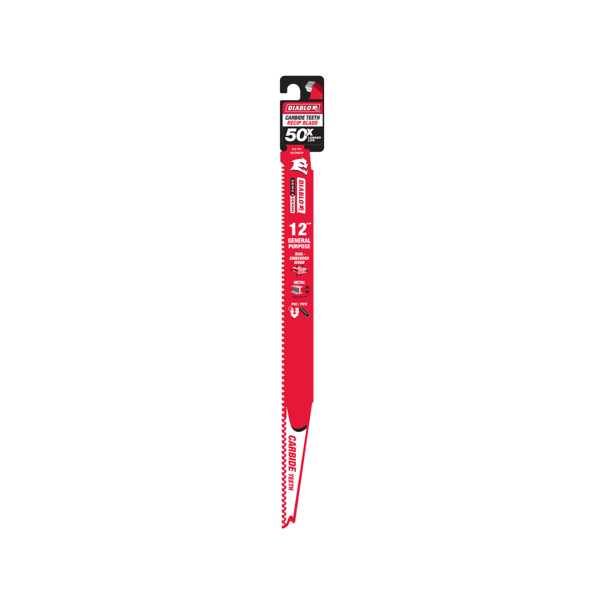The Diablo 12 Demo Demon Carbide General Purpose Reciprocating Saw Blade is suitable for various cutting applications.