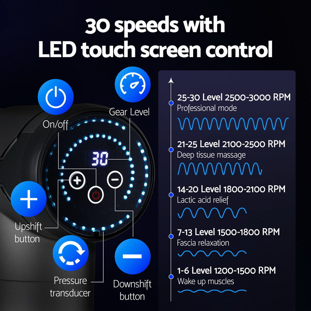 Experience deep muscle relief with the Everfit Massage Gun. Featuring a high-torque brushless motor, it provides high-frequency vibration at 1200-3000 strokes per minute, ideal for muscle relaxation at home. The rechargeable lithium batteries allow for up to 2 hours of use.