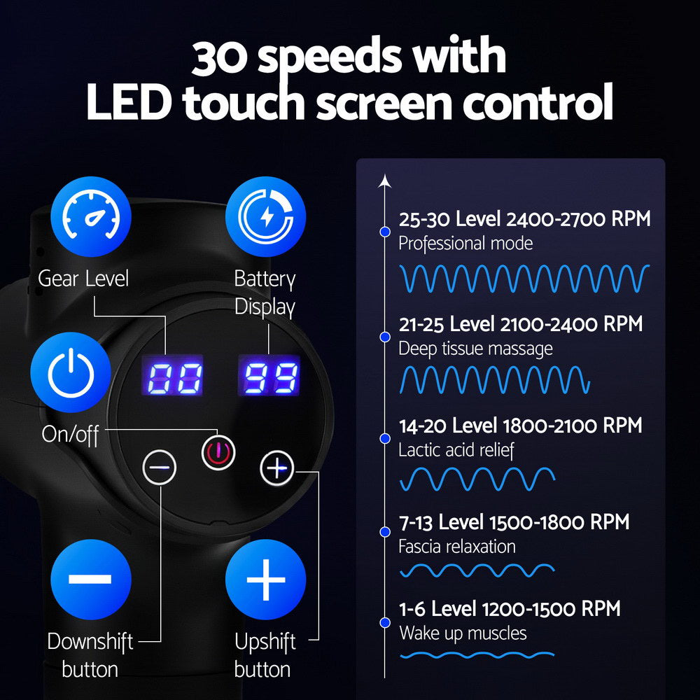 Whether you're a hard-core gym junkie, a dedicated office worker or recovering from an injury, you'll find relief with an Everfit Massage Gun. With a powerful high-torque brushless motor, the massage gun allows for high-frequency vibration at 1200-2700 strokes per minute and penetrates deeply for muscle relaxation from the comfort of home. The massage gun uses long-lasting and efficient rechargeable lithium batteries that allow the gun to run for up to 3 hours. There are 30 speed levels to suit various purposes; from simply waking up your muscles to relieving lactic acid and assisting muscle recovery after exercising, or even intense professional-level massages. The non-slip rubber handle provides a comfortable grip to reduce hand fatigue, and the device operates quietly for a comfortable massage experience. The smart touch LED display makes it easy to customize your massage experience. With 8 unique head attachments, the Everfit Massage Gun can help you dissipate fatigue, relax your muscles and relieve neck and back pain. Gets yours today and continue your fitness journey in comfort.
