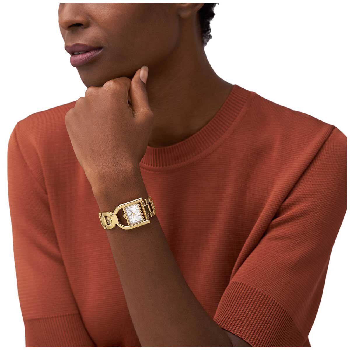 Embrace intentional style with the Fossil Harwell Gold Tone Women's Watch ES5327. This timeless piece is designed to accompany you through every moment of your day. Featuring a case adorned with our iconic Fossil Heritage D-Link, this statement watch boasts a silver sunray dial and a polished gold tone stainless steel bracelet that exudes classic elegance.