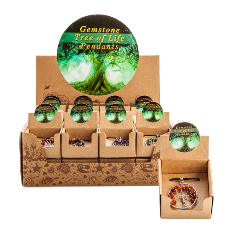 Beautiful leather cord necklace with Tree of Life pendant Leaves of the tree are made from natural gemstones Comes in 7 assorted gem types including: rose quartz, clear quartz, amethyst, tiger eye, aventurine and carnelian