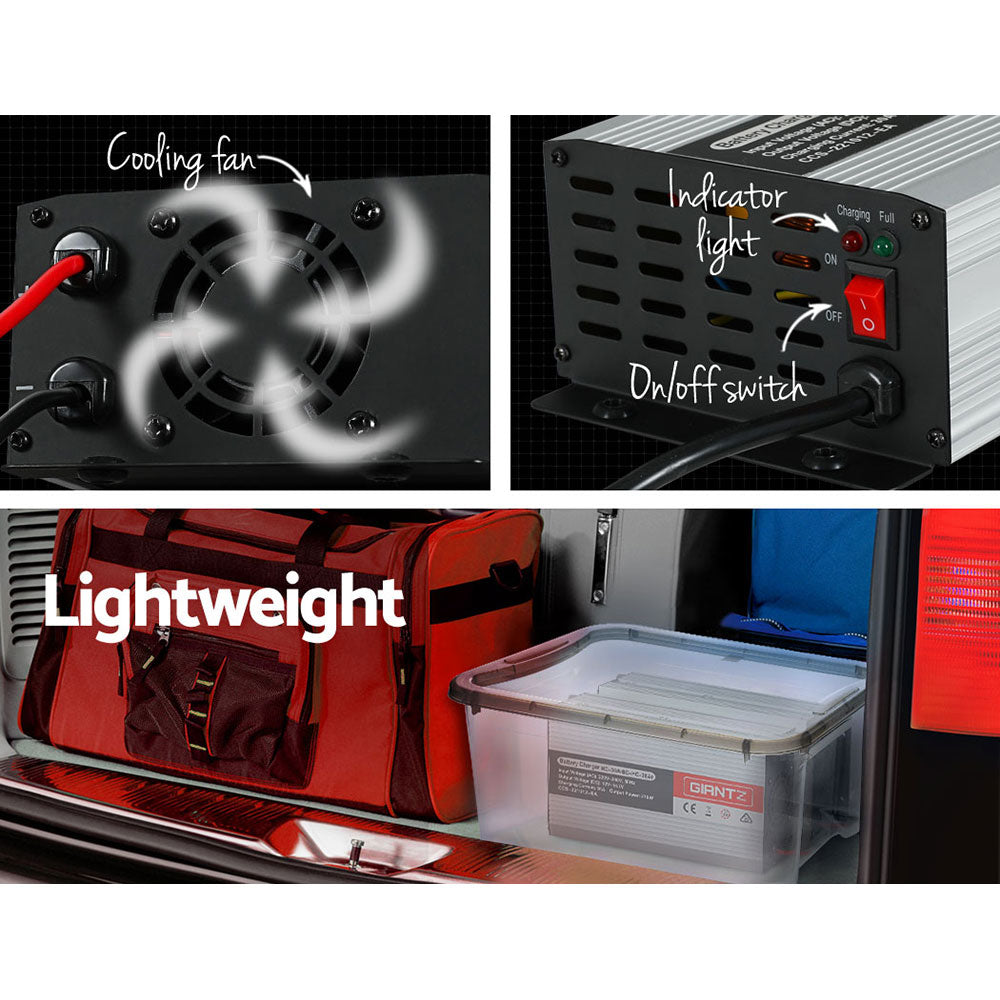 Specifications: Brand: Giantz Input voltage (AC): 220V-240V, 50Hz Output voltage (DC): 12V-14.7V Charging current: 30A Output power (HP): 375W Dimensions: 26 x 12.5 x 6.5cm Number of Packages: 1 Assembly Required: No
