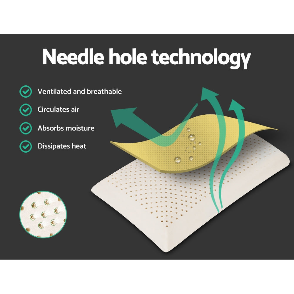 Features * 100% natural latex pillow * High resiliency and soft feeling * Naturally supports your head and neck * Fast rebound with zero pressure * Needle hole technology * Ventilated and breathable * Moisture absorption * Premium heat dissipation * Firm and springy * No deformation * Removable and washable zippered cover * Eco-friendly * Anti- dust mite, anti-bacteria and mold-proof