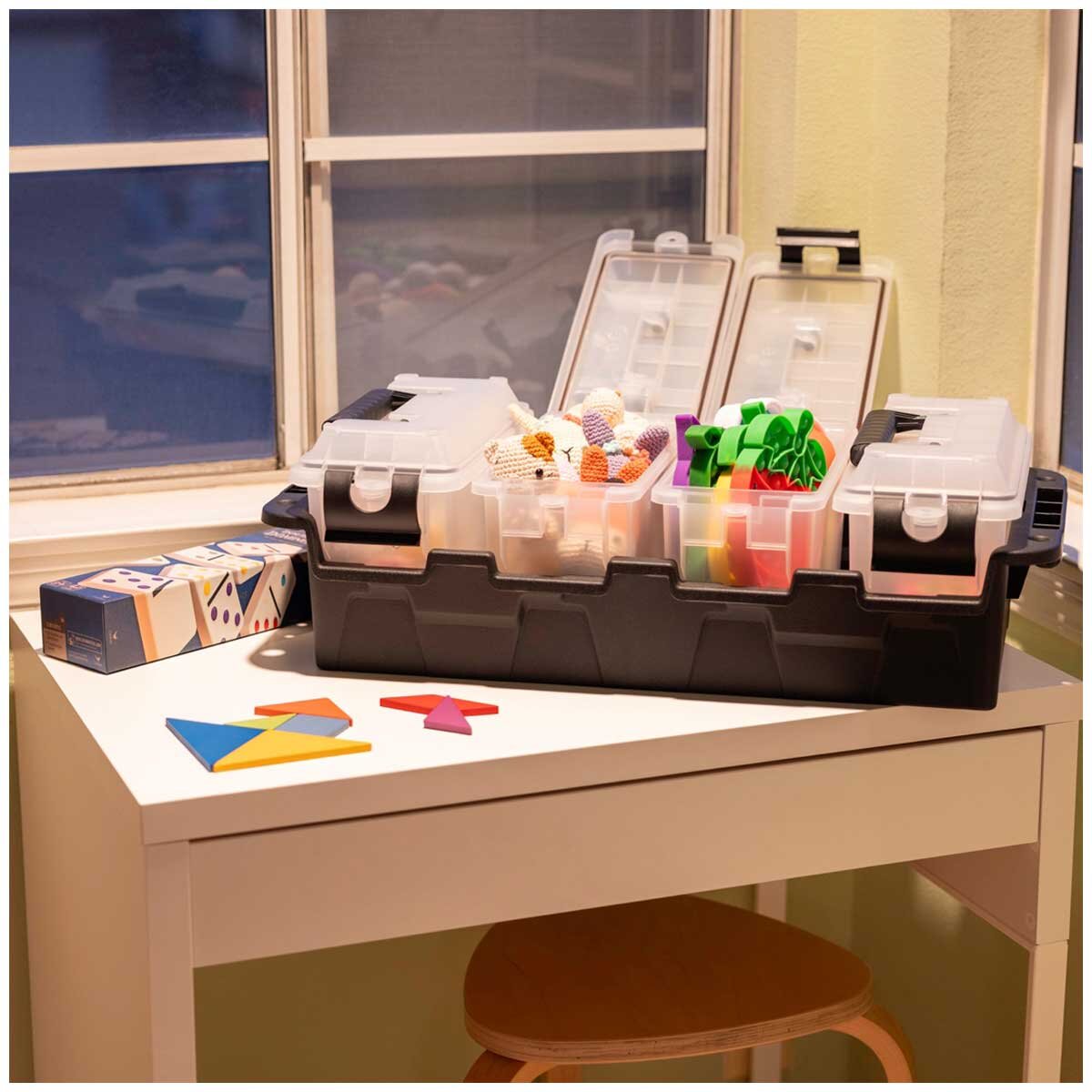 **Product Description:**A set of four clear polypropylene storage containers designed for tight organization and long-term durability. Each container includes a waterproof silicone gasket, padlock holes for secure storage, reinforced side ribs to maintain shape under weight, and flat tops for stable stacking.
