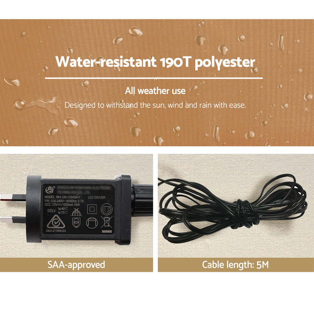 Specifications:Illuminable Design: YesLight bulb type: Cold whiteLight bulb count: 3Material : 190T polyesterVoltage: 12VPower cord length: 5mOverall dimensions: 149cm x 30cm x 240cmAssembly required: YesNo. of packages:1