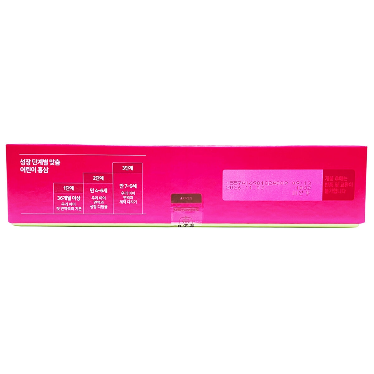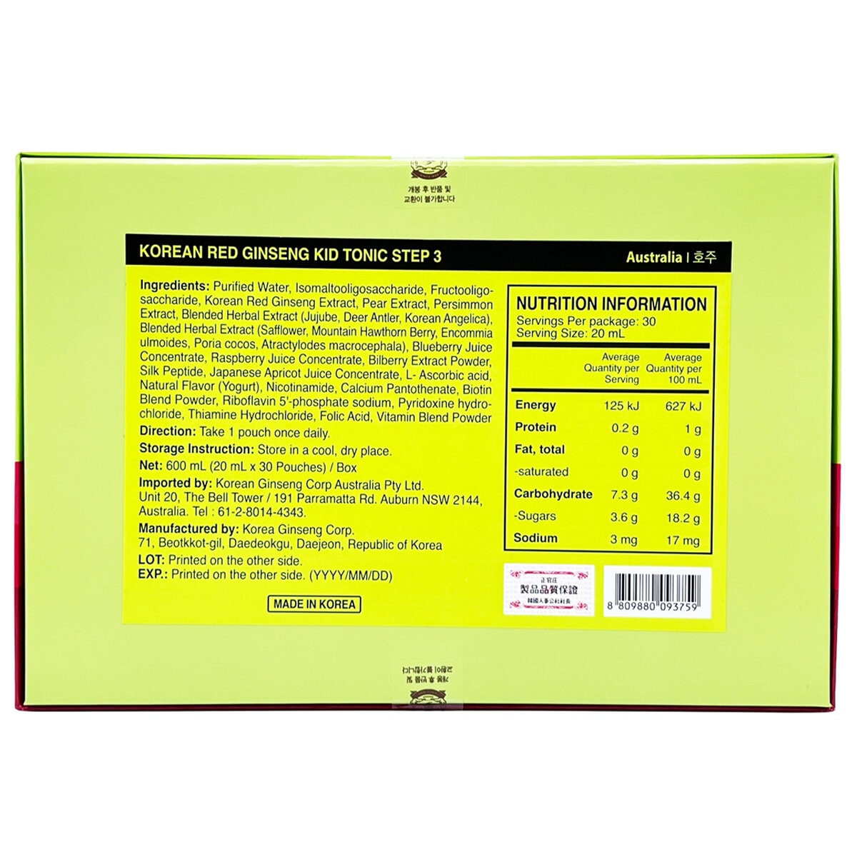 Support your child's immune health with Jung Kwan Jang Kids Tonic Step 3, specially formulated for children aged 8 to 10. Made with premium red ginseng roots and enriched with deer antlers, aureobasidium pillulans, calcium, and other beneficial ingredients, this tonic helps boost physical strength and immunity in young children.