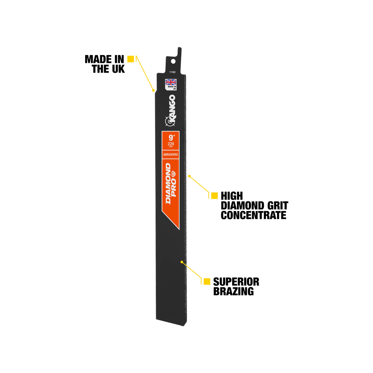 Kango 228mm Diamond Pro Recip Blade is a diamond-grit blade designed for cutting cast iron, hard tiles, masonry, and abrasives with precision.