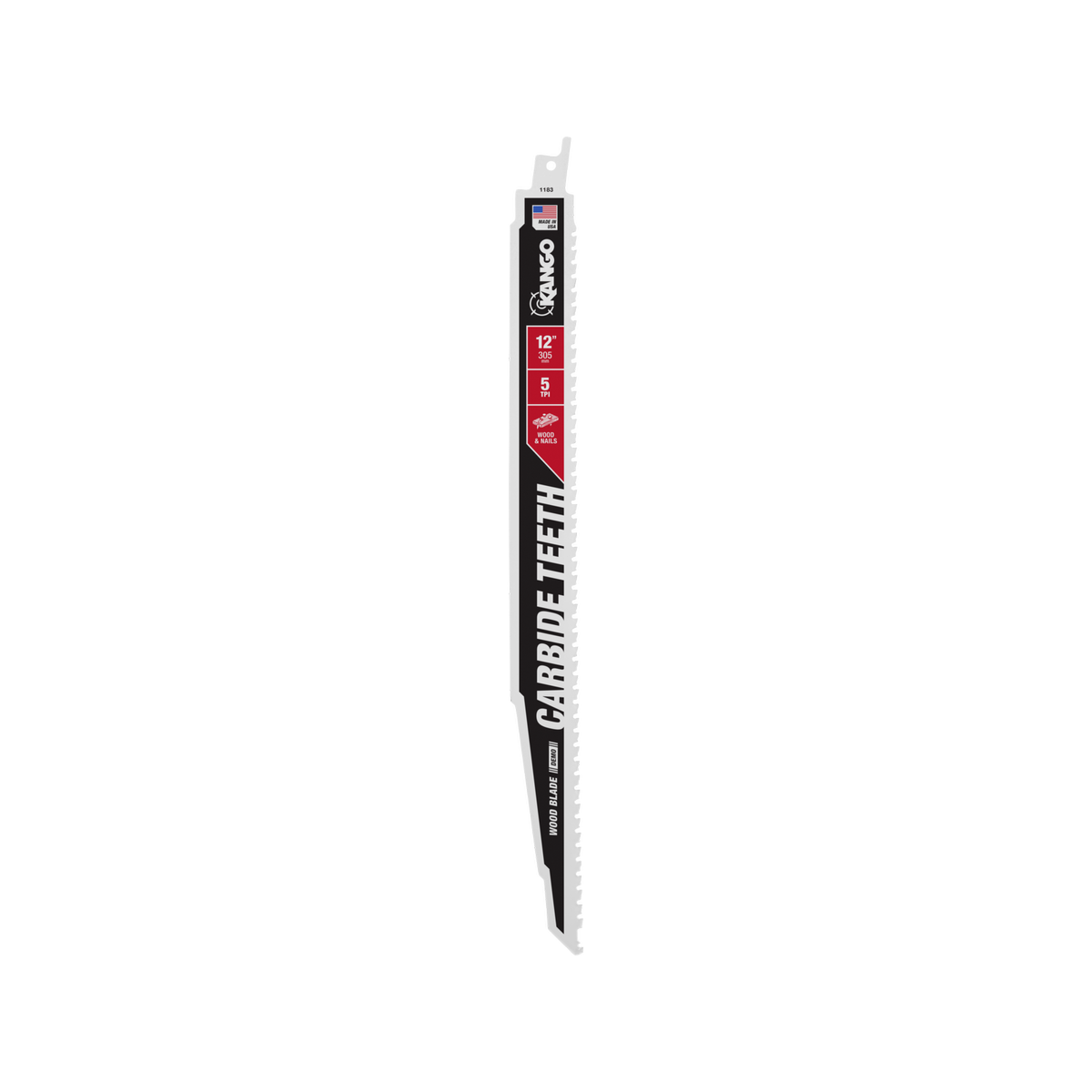 The Kango 12" 5 TPI Carbide Teeth Wood Reciprocating Blade is engineered for exceptional longevity and cutting efficiency. With carbide teeth that last 50 times longer than standard bi-metal blades, this blade reduces downtime associated with blade replacement. Each tooth contains 25% more carbide than competing products, enhancing both blade life and cutting performance. This reciprocating blade is capable of cutting through a variety of materials, including nail-embedded wood, hardened fasteners, rebar, and stainless-steel rods, making it suitable for diverse applications. Additionally, it features Tooth Armor for improved durability against nails and a Sabre Tooth design for rapid plunge cutting.