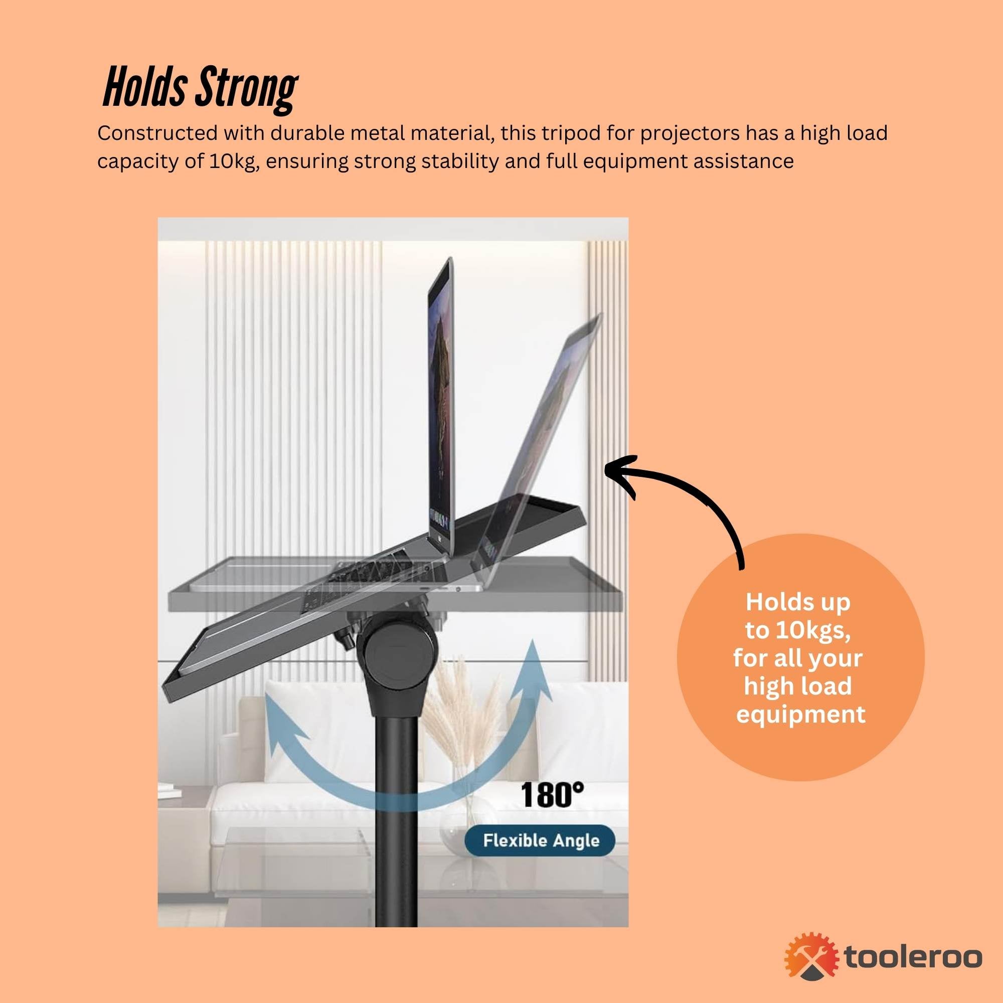 Your new go-to gadget: our sturdy, adjustable projector laptop tripod stand! This ultimate portable accessory is perfect for today's dynamic professional. With a solid tripod base and a flat, tilt-adjustable tray, it’s ideal for holding your projector, laptop, studio monitor, or even doubling as a music stand. The stand also features a gooseneck phone mount optimising versatility. Whether you're giving a presentation, enjoying a movie night, or rocking out in your studio, this stand has got you covered.