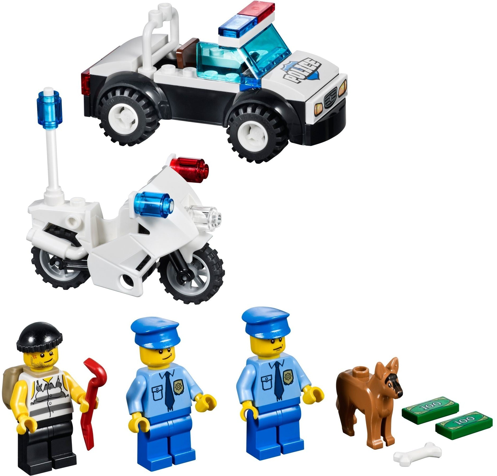 There’s been a breakout down at the town prison. One of the crooks has been able to escape, and now he’s on the run! Give chase with the motorcycle and police car, then return him to the police station and back behind bars where he belongs! The fantastic Police: The Big Escape set is a great way to introduce your young builder to LEGO® brick building. It makes a great gift set, too. Includes 3 minifigures with assorted accessories: 2 policemen and a crook.
