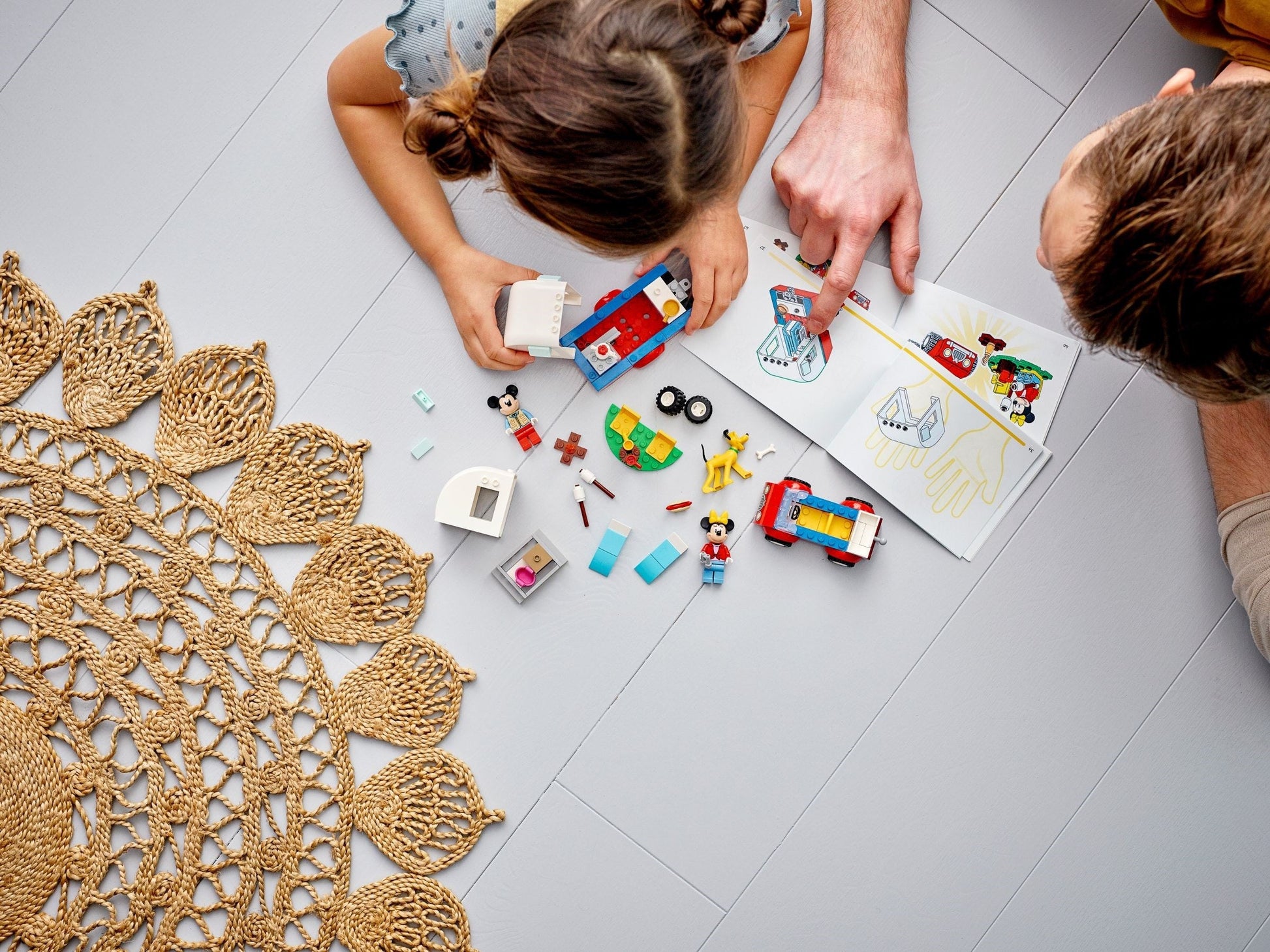 Boost the building skills of kids aged 4+ with this LEGO® | Disney Mickey and Friends – Mickey Mouse and Minnie Mouse’s Camping Trip (10777) set, featuring 2 vehicles, 2 smaller builds, 2 minifigures, and a LEGO dog figure. Kids can have loads of adventures exploring the off-road wilderness in a camper van.