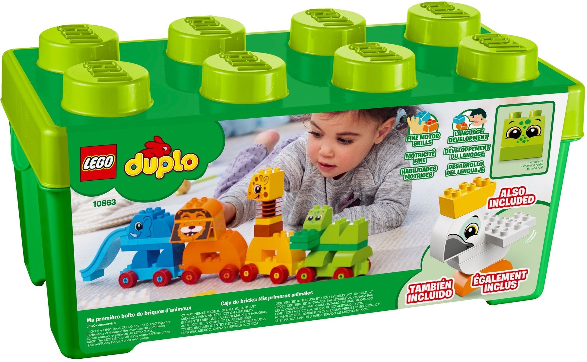 Toddlers will have so much fun building their own animal train with the My First Animal Brick Box! Help them sort the bricks into different colours and talk about each iconic animal as you build them and enjoy creative play together: an elephant with a slide for a trunk, a crocodile with hinged jaws, a lion with an opening mouth, a giraffe with a bendy neck, and a white bird. The bright and chunky LEGO® DUPLO® bricks are specially designed to be fun and safe for small hands and come in a handy storage box.