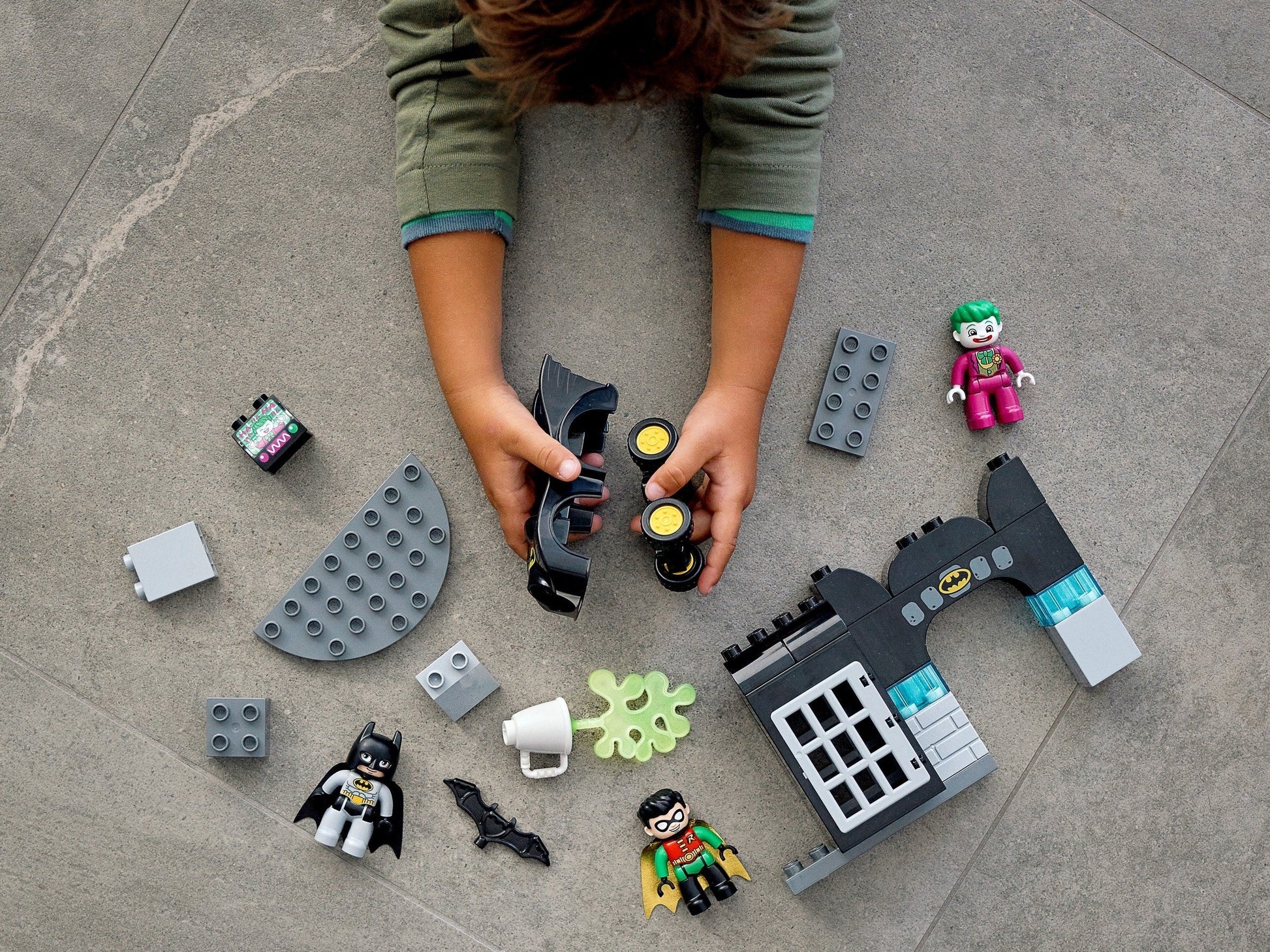 Developmental play with Batman and RobinLEGO® DUPLO® Batman BatcaveTM (10919) features Batman, Robin, and THE JOKER in a versatile playset designed to encourage creative play and stimulate developmental benefits. Infants build fine motor skills as they manoeuvre the BatmobileTM toy through the gate and open and close the jail door. Role-playing the interaction between the 3 characters encourages social and emotional development.